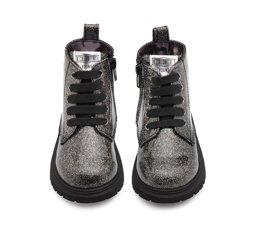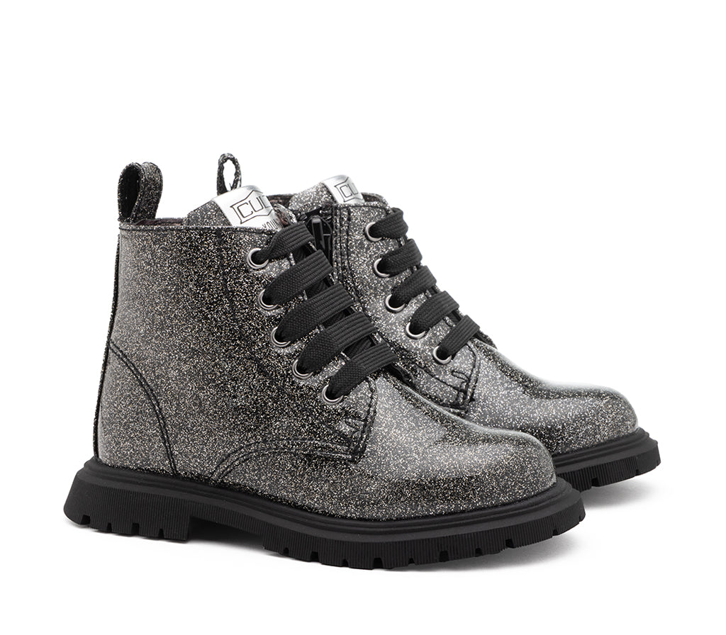 Perfetti per un look scintillante che non passa inosservato! Questi anfibi Primi Passi da bambina combinano la robustezza di un anfibio con un'irresistibile finitura glitterata. La suola a carro armato e la chiusura con lacci garantiscono stabilità, mentre la cerniera laterale li rende facili da indossare. Un tocco di scintillio per rendere speciale ogni passo.