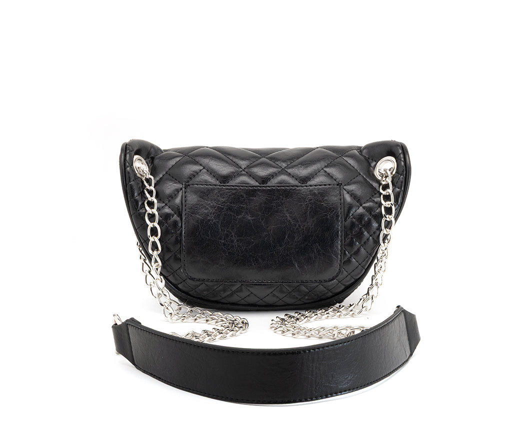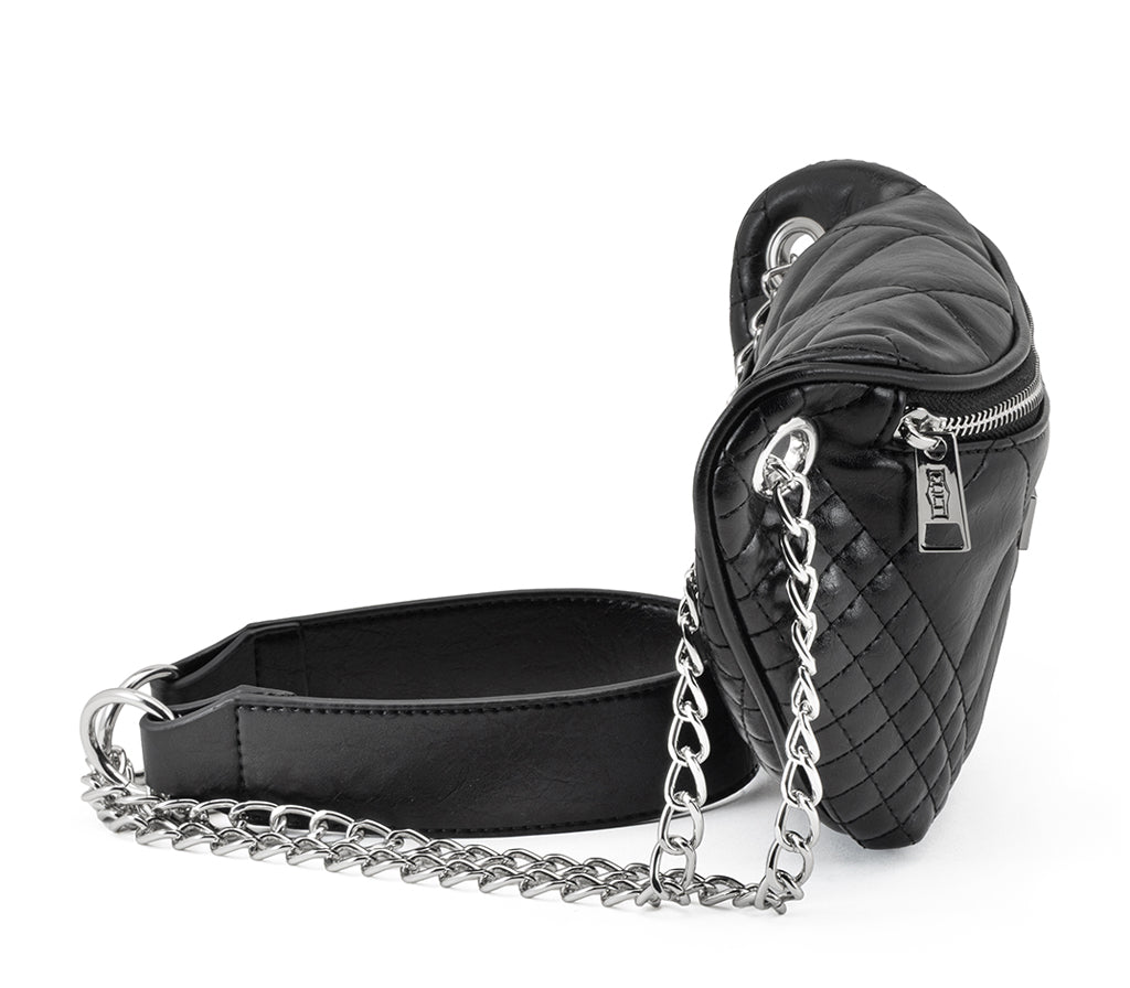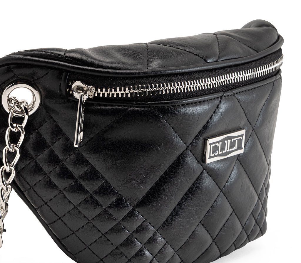 Accessorio must-have firmato CULT per la stagione SS26, il marsupio a spalla Harvey reinterpreta la praticità urban in chiave glam-rock. Caratterizzato dalla raffinata lavorazione trapuntata a diamante in ecopelle nera, questo modello si distingue per la sua silhouette asimmetrica e decisa. La robusta zip superiore, l'iconica placca logo argentata e la tracolla regolabile arricchita da una catena metallica lo rendono l'alleato perfetto per chi cerca uno stile audace, libero, femminile e assolutamente cool. Dimensioni: 10x15x8.