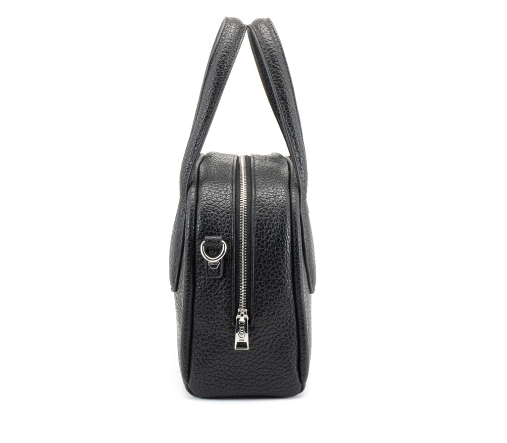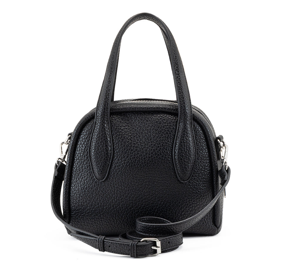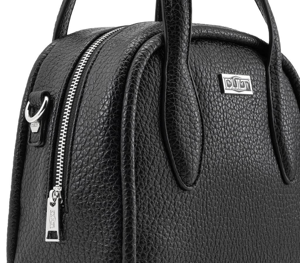 Compatta e dal carattere glam-rock la nuova borsa Myles firmata CULT e realizzata in materiale effetto pelle martellata nera. La struttura definita con doppio manico e chiusura zip la rende pratica e versatile, mentre il logo metallico frontale firma il design con un tocco distintivo. Abbinala a un pantalone sartoriale per un contrasto contemporaneo oppure a un abito in maglia per un look essenziale e femminile dal mood deciso. Dimensioni: 25x21x12.