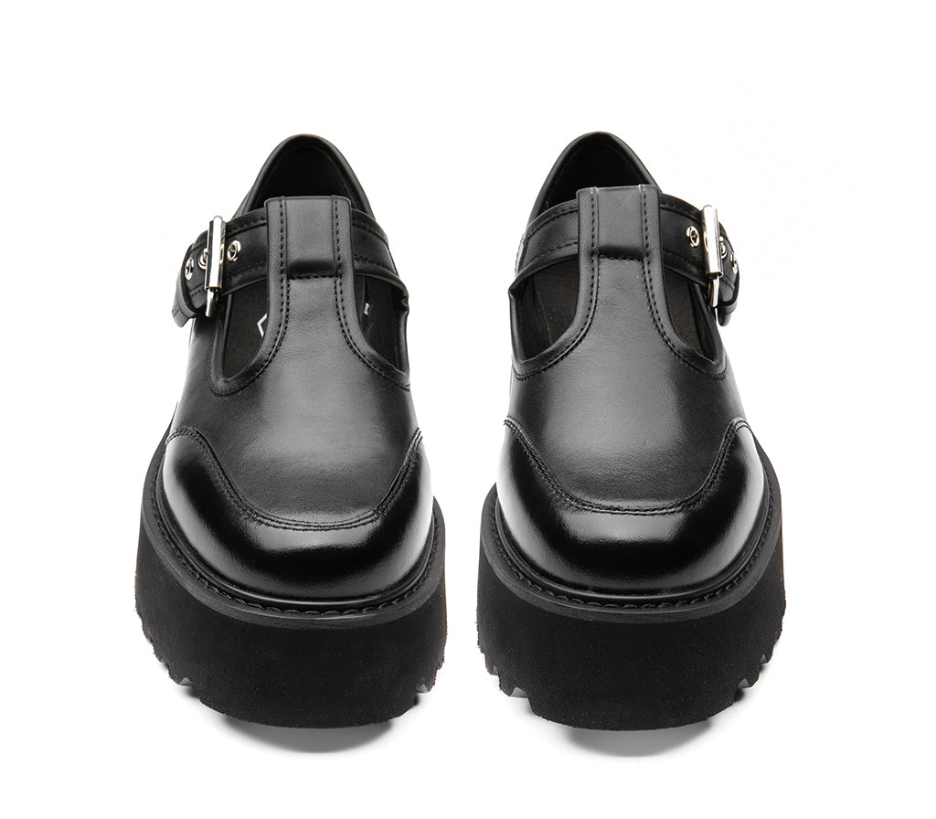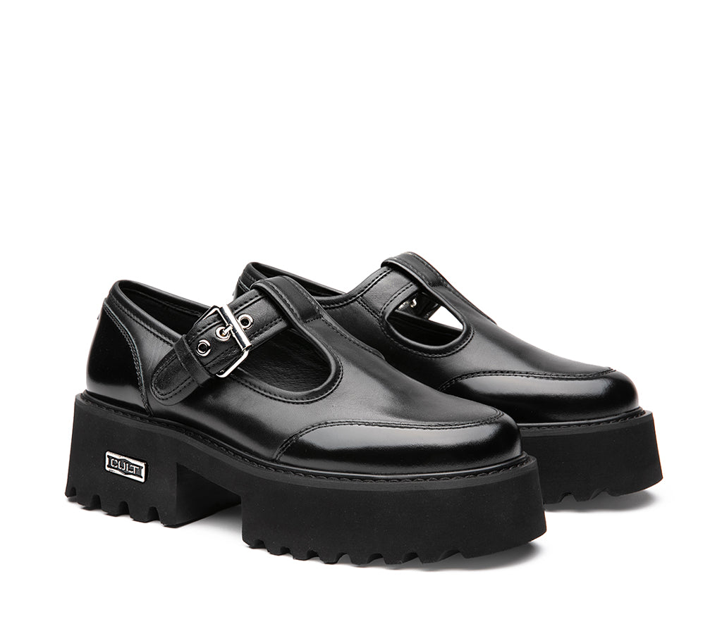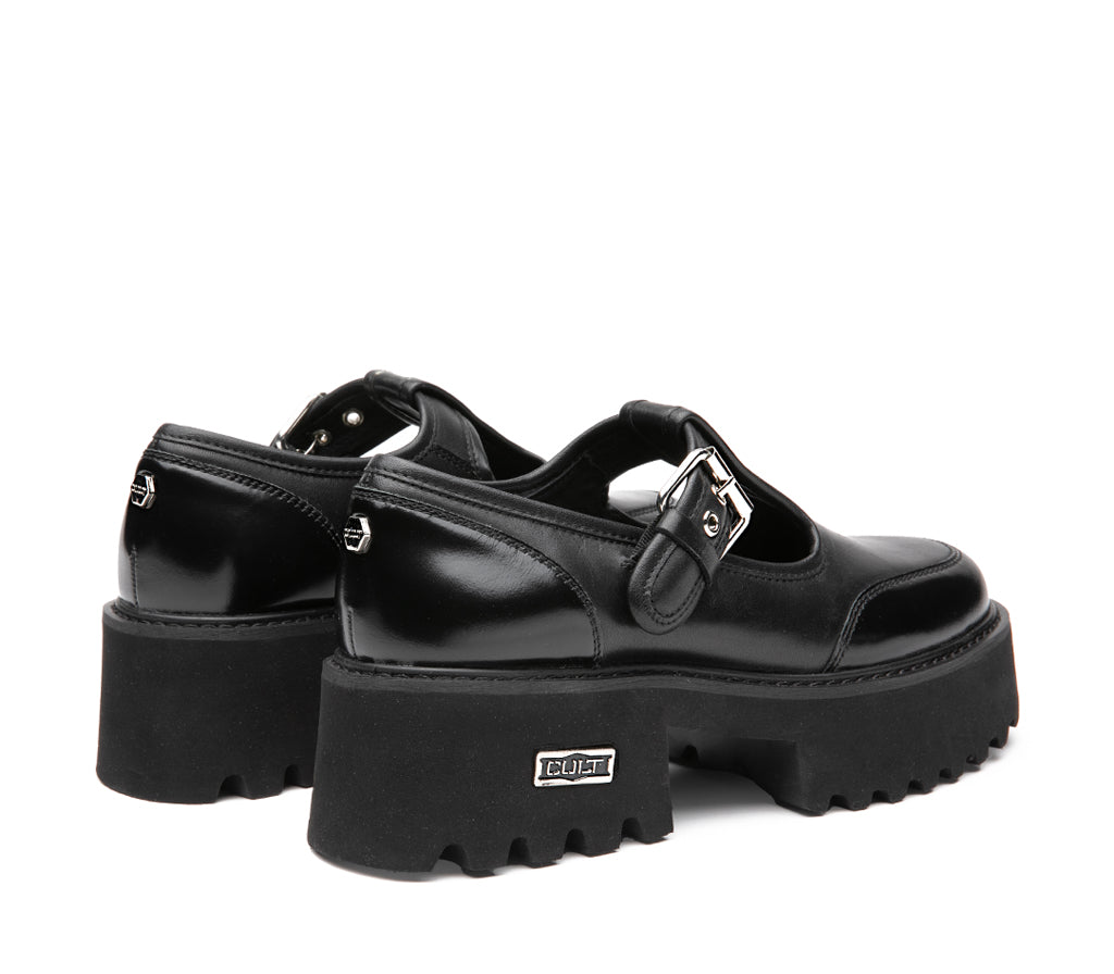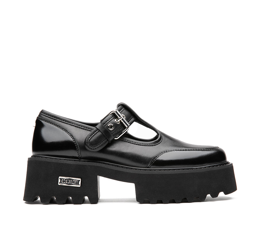 Un’icona dallo spirito deciso, questo nuovo modello firmato Cult combina pelle nera spazzolata e una suola platform carrarmato per un look forte ma femminile. Il design T-bar con cinturino e fibbia metallica offre una calzata sicura e di tendenza, mentre il logo del brand inciso sulla piastrina laterale aggiunge un dettaglio distintivo e raffinato. Perfetta per chi ama un mix tra stile college e street wear moderno. Altezza tacco 5 cm.