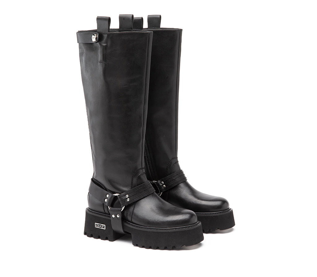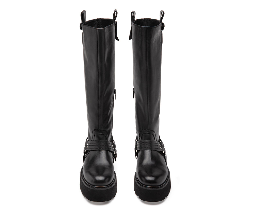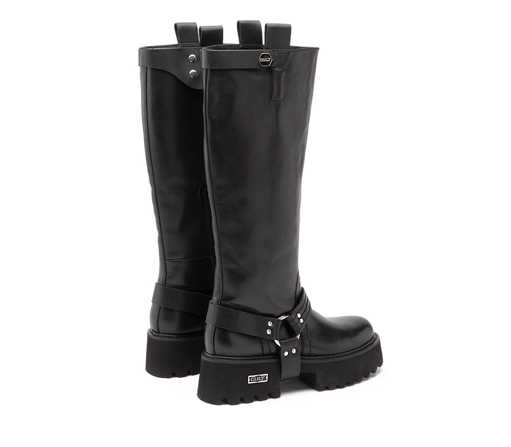 Questo nuovo stivale alto CULT è il manifesto di un’eleganza alternativa, che osa: realizzato in pelle nera con suola chunky scolpita per il massimo grip, conquista con i suoi dettagli rock. Il cinturino alla caviglia con anello e fibbia metallica aggiunge carattere, mentre la doppia presenza del logo CULT — inciso su piastrina laterale e sul bullone del cinturino superiore — ne sottolinea l’identità grintosa e riconoscibile. Altezza tacco 5 cm.