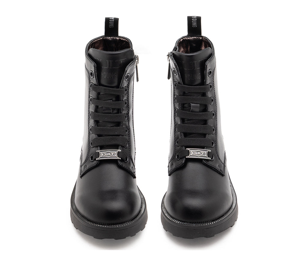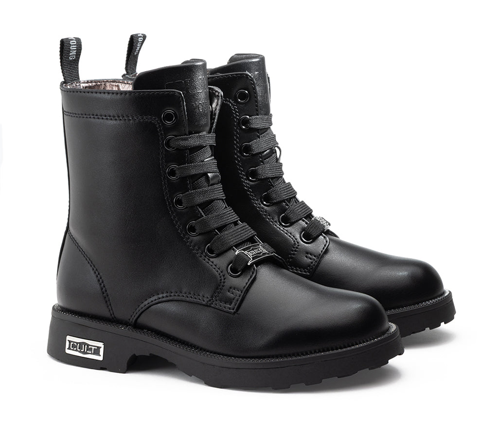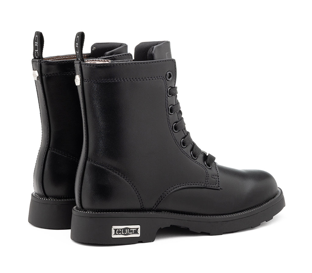 Grintosi e affascinanti, questi stivali Cult Kids in ecopelle sono perfetti per aggiungere un tocco unico al look della tua bambina. Il design alto, ispirato al classico anfibio, è impreziosito da due file di borchie a forma di cuore, che donano un tocco dolce e rock. La chiusura con lacci e la pratica zip laterale garantiscono una calzata sicura e veloce. La suola carrarmato, robusta e antiscivolo, è decorata da una fila di piccole borchie sul bordo e da una targhetta con il logo Cult che ne completa lo stile audace.
