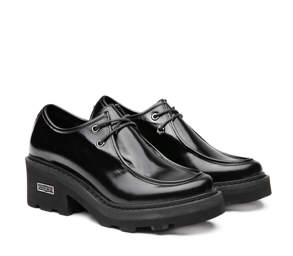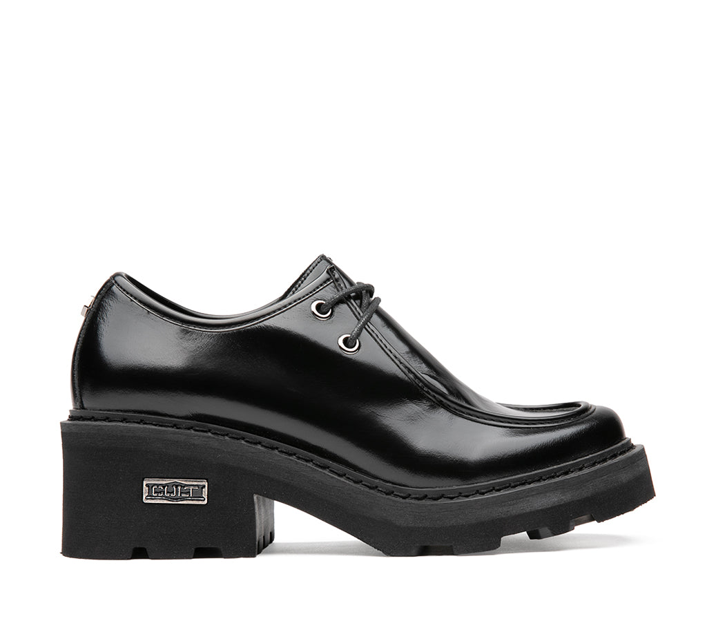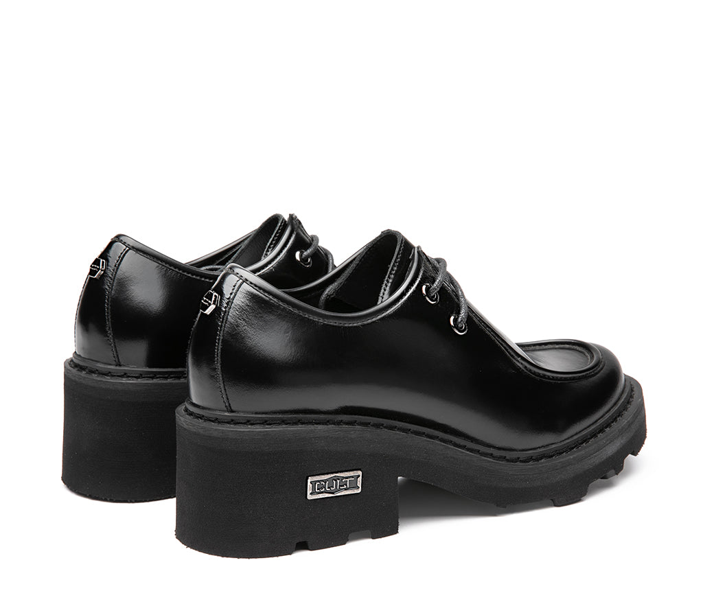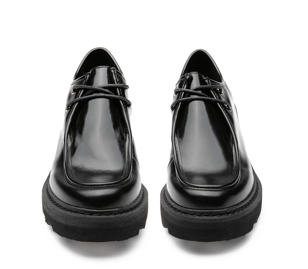 Chunky Soul, Spirito Urban. Questo modello CULT della linea GRACE è una dichiarazione di stile audace e contemporaneo. Realizzata in pelle nera lucida, la tomaia si presenta essenziale ma grintosa, con allacciatura tramite occhielli metallici per un look industrial e maschile. Il fondo platform chunky scolpito, dalla linea massiccia e caratteristica, dona altezza, stabilità e forte personalità. Sul lato della suola spicca la placca metallica con il logo del brand, che identifica l’anima ribelle e street del modello. Altezza tacco 5 cm.