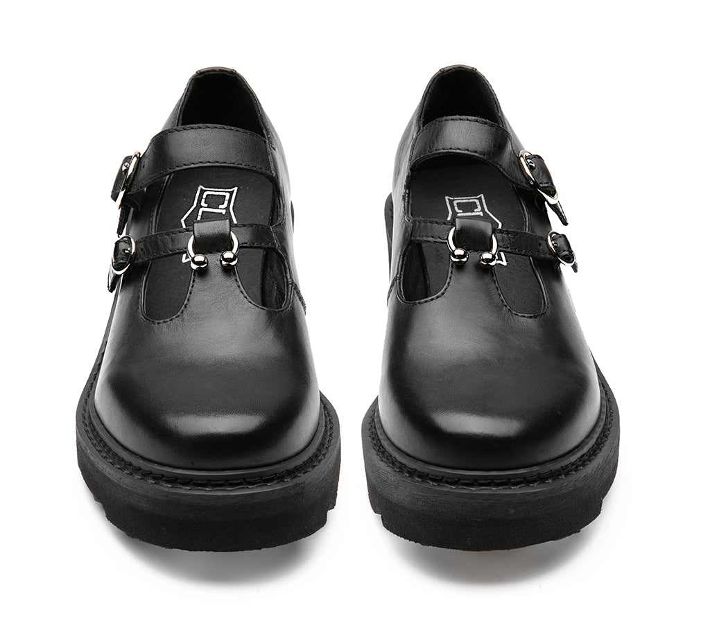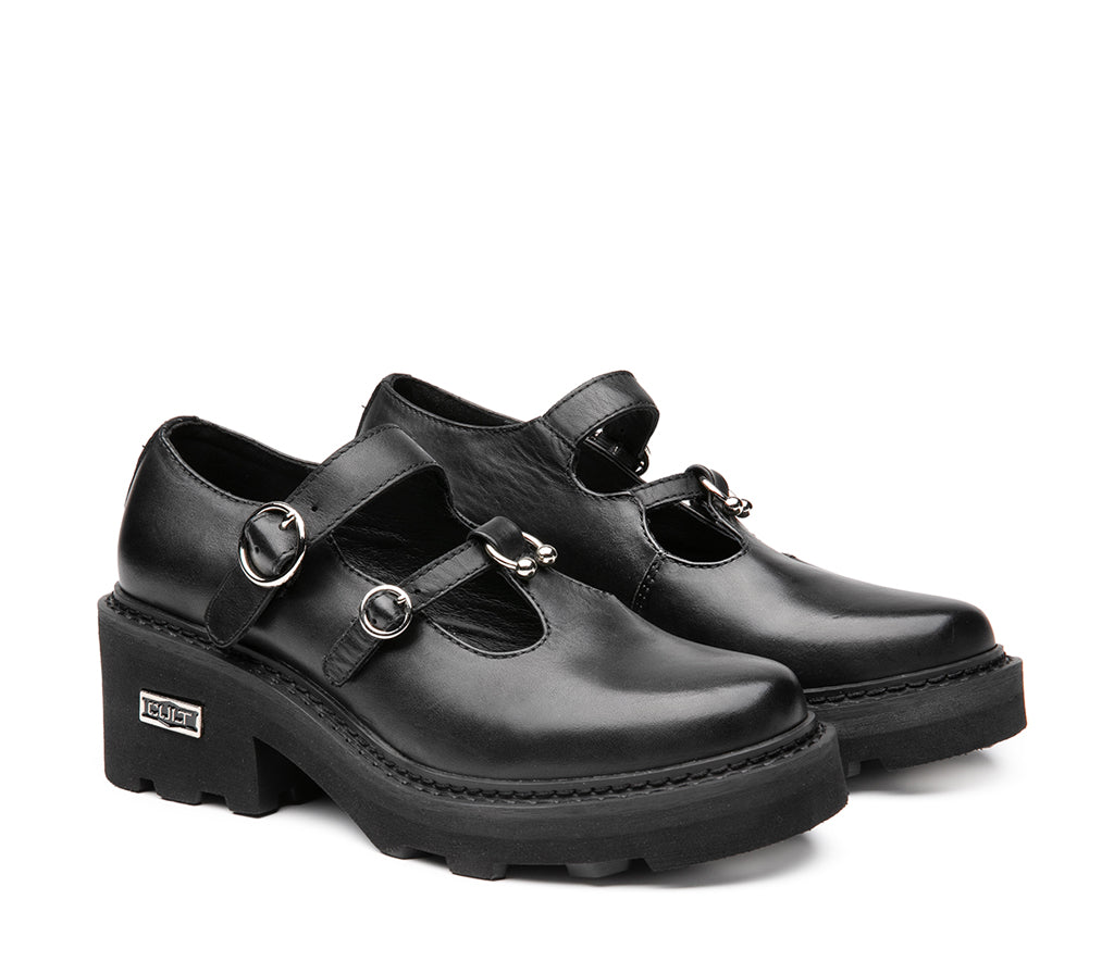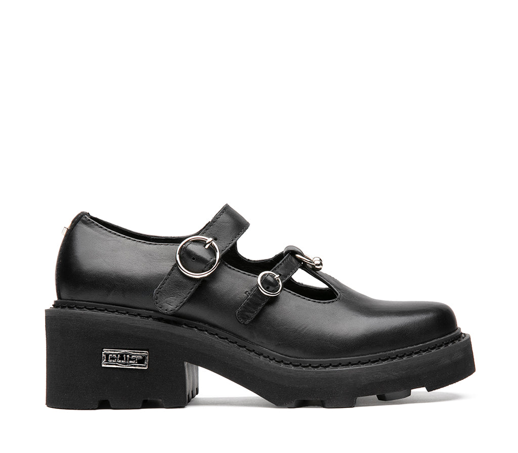 Mary Jane ribelle con platform chunky: questo nuovo modello GRACE by Cult reinventa il classico Mary Jane in chiave bold e alternativa. La tomaia in pelle nera lucida è valorizzata da due cinturini con fibbie metalliche argentate e piercing, che donano grinta e definizione. Il vero protagonista è il fondo platform chunky: massiccio, scolpito, con grip deciso e anima urban. Sul lato spicca il logo metallico CULT, a firmare con stile la silhouette. Il design con punta arrotondata bilancia robustezza e femminilità. Altezza tacco 5 cm.