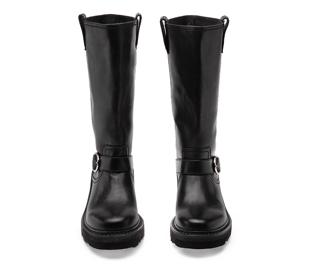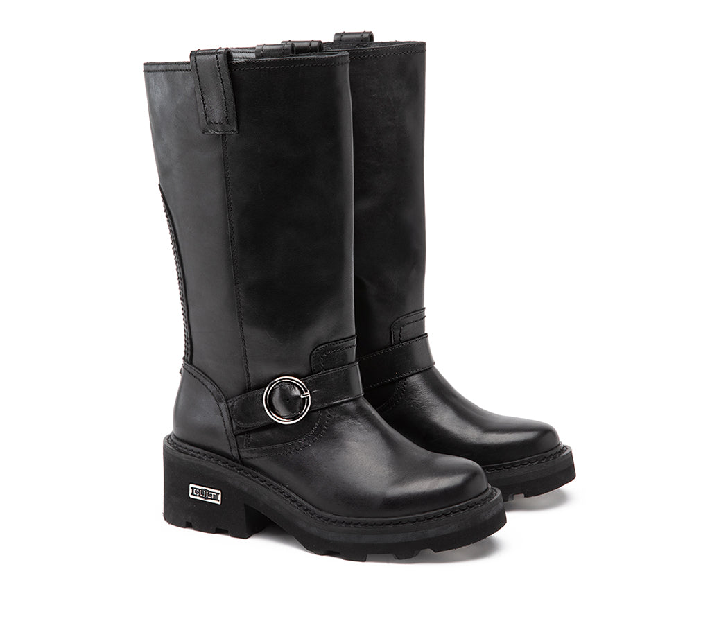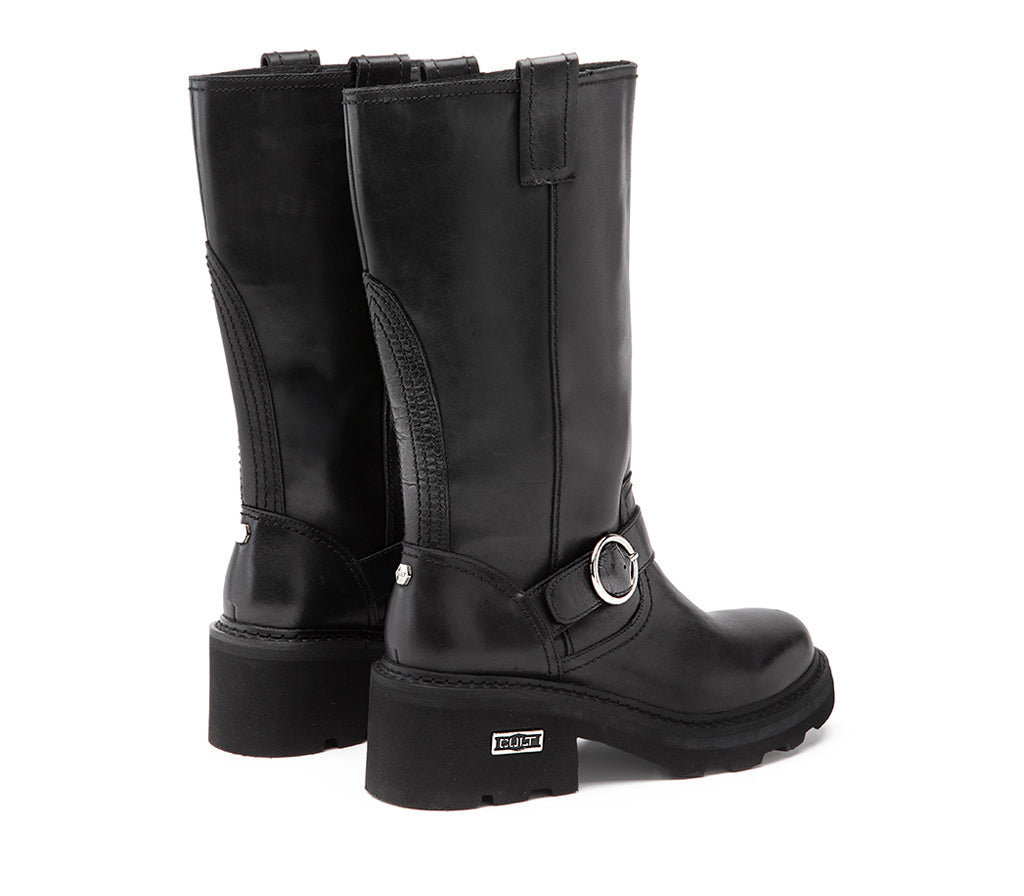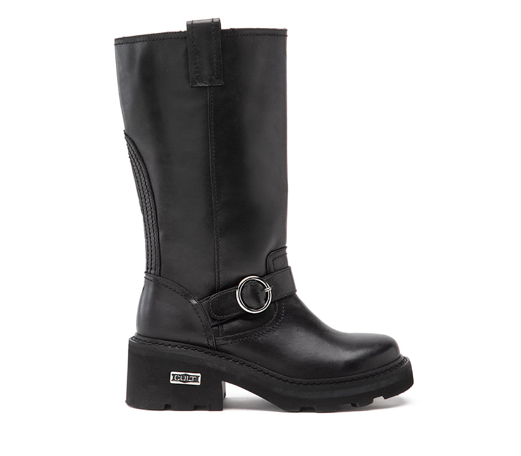 Eleganza ribelle con anima fashion per questo stivaletto mid-calf firmato CULT. E' caratterizzato da una costruzione robusta, perfetta per un’attitude urban-chic: tomaia in pelle nera, suola zigrinata e tacco chunky per affrontare la città con stile. Il cinturino decorativo con fibbia argentata rotonda e la placca metallica CULT sul tallone aggiungono grinta e riconoscibilità al design. Ideale per look edgy e per chi ama distinguersi. Altezza tacco 5 cm.