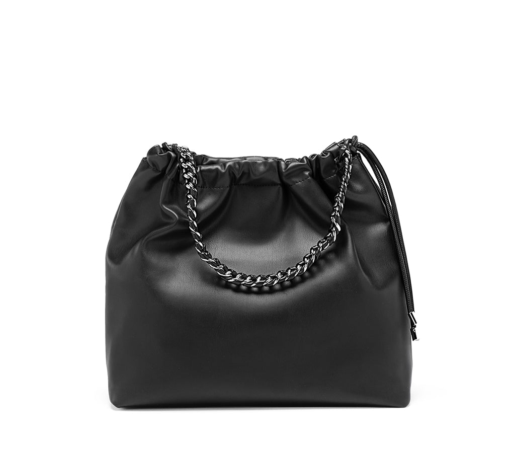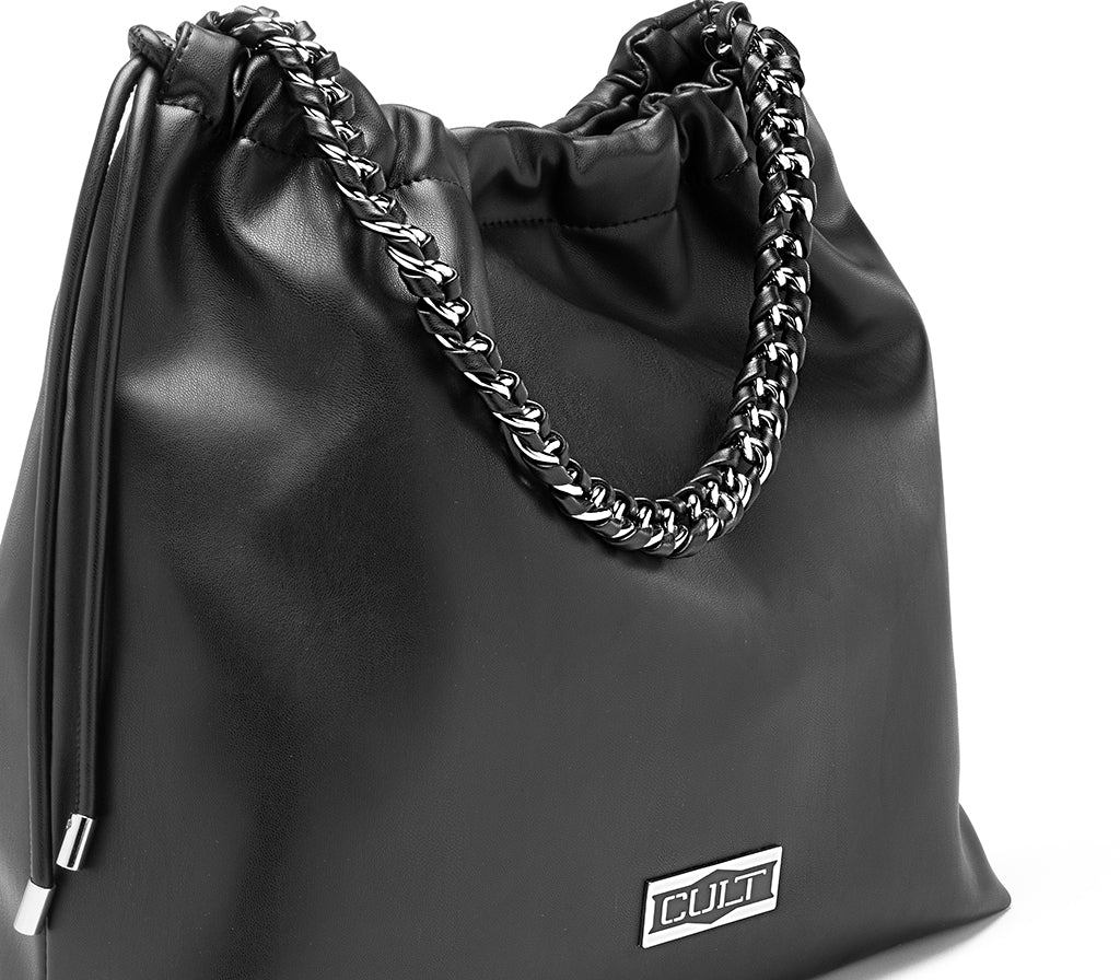 Questa borsa a mano in ecopelle nera unisce linee pulite e dettagli raffinati. La silhouette rettangolare con angoli leggermente arrotondati è valorizzata da un manico a catena e da una targhetta metallica con logo sul fronte. Un accessorio versatile e chic, perfetto per completare look sia da giorno che da sera.