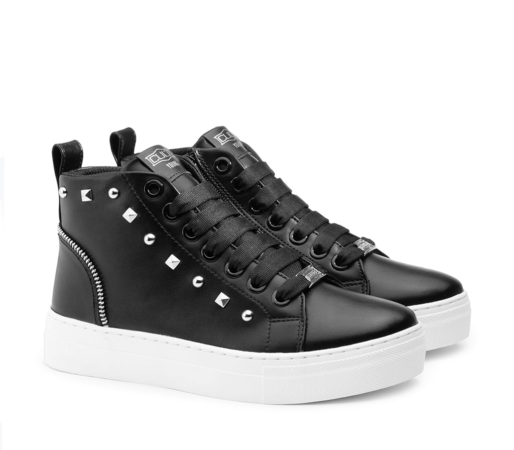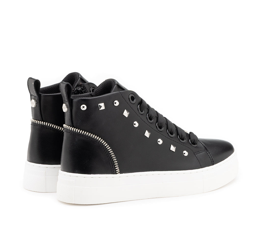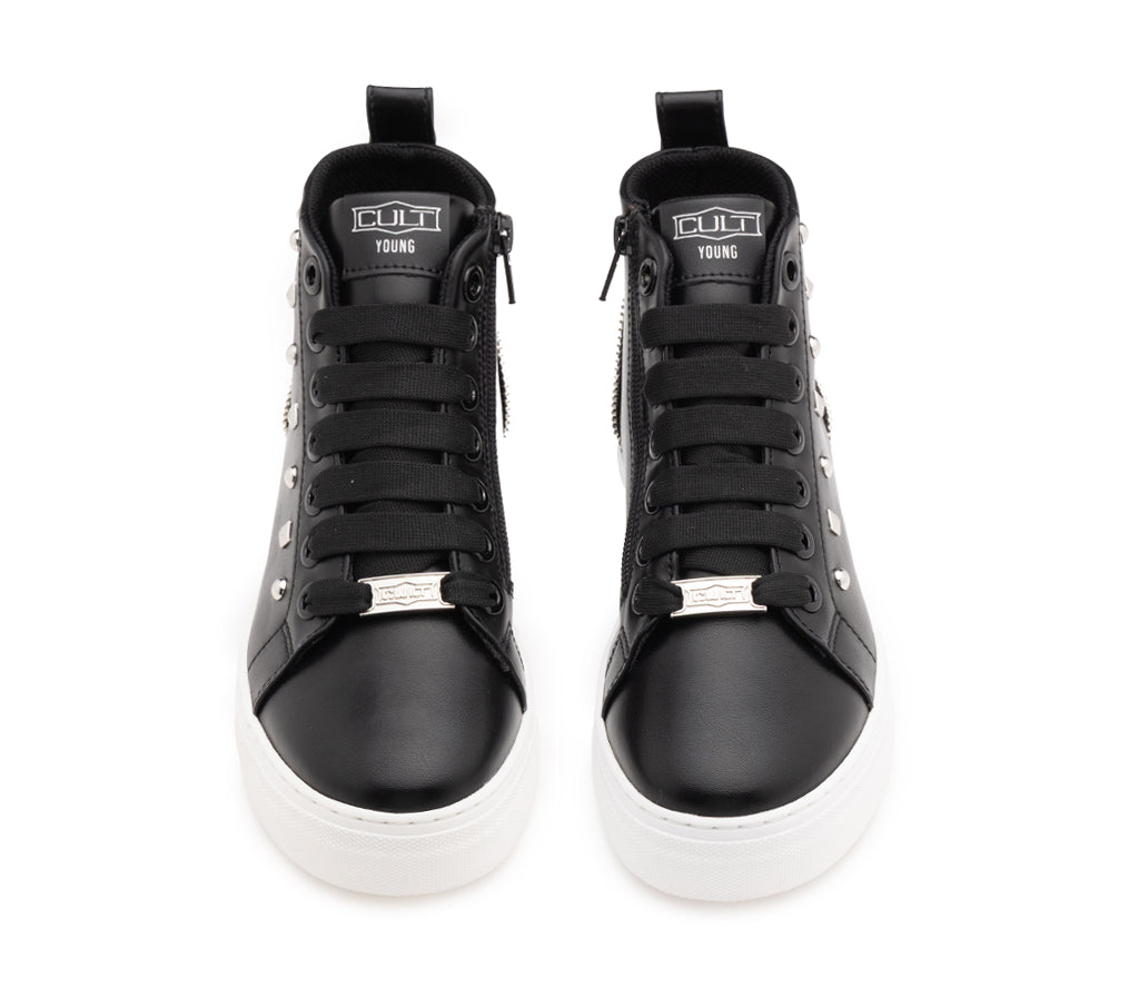 Un'esplosione di stile rock per queste sneakers alte Cult Young in ecopelle nera: il mix perfetto di comfort e grinta. Il design è impreziosito da borchie a piramide e borchie rotonde lungo la parte superiore, che donano un look audace. Una zip decorativa con borchie a pallina sul lato esterno aggiunge un ulteriore elemento di stile.