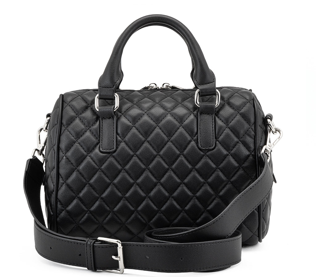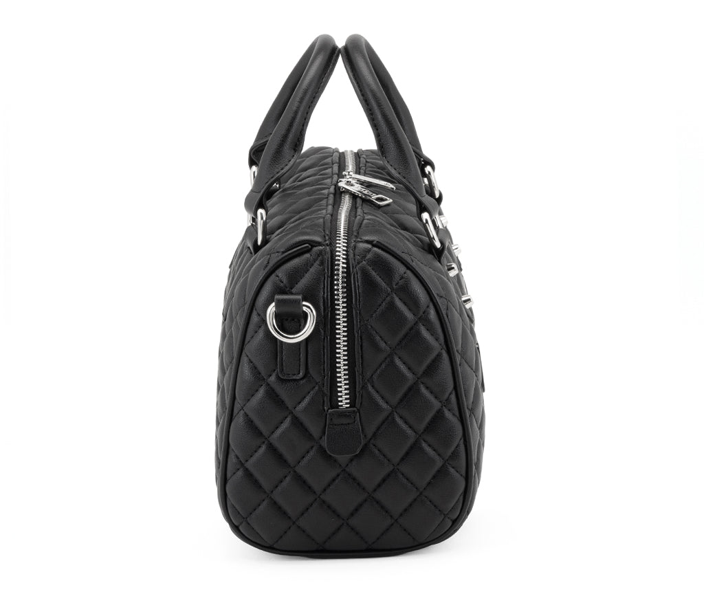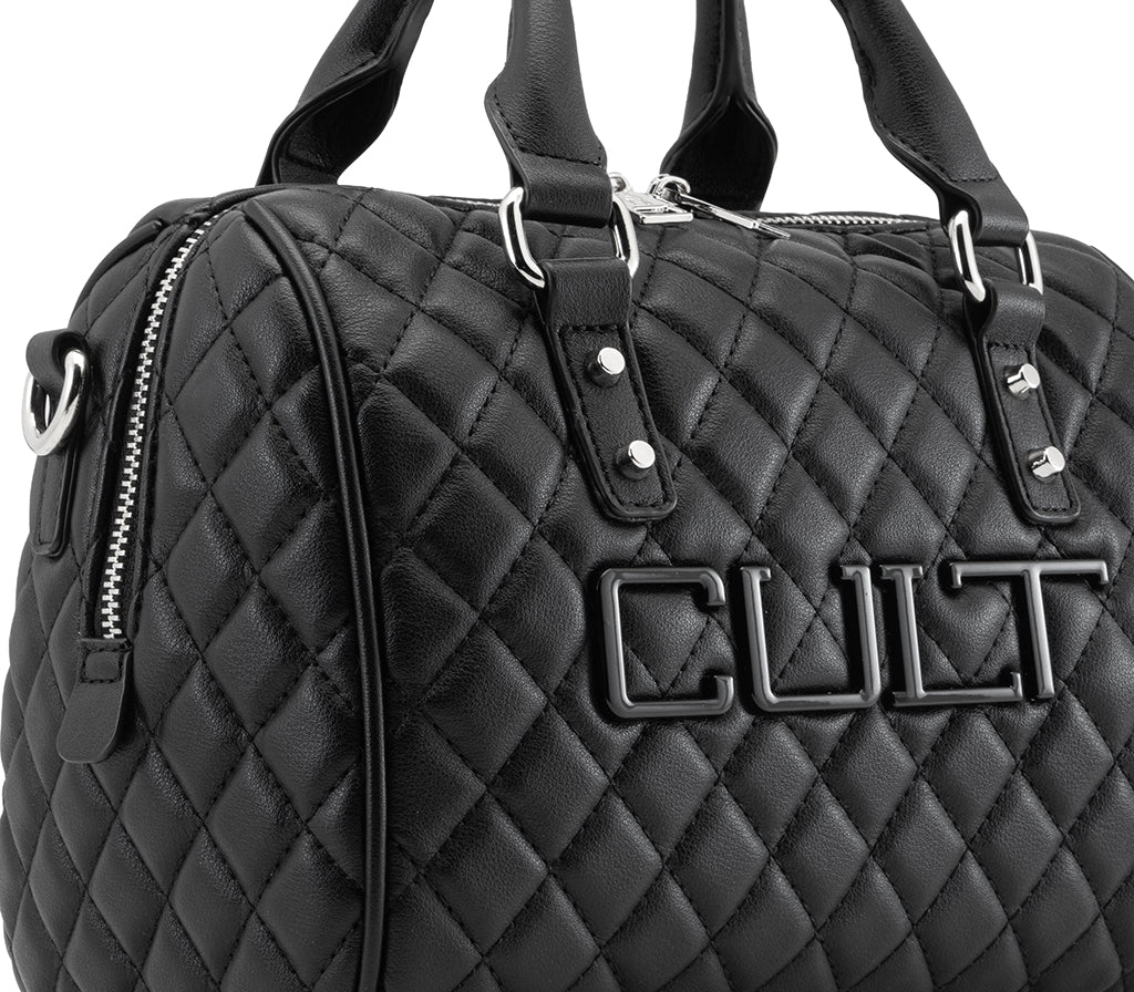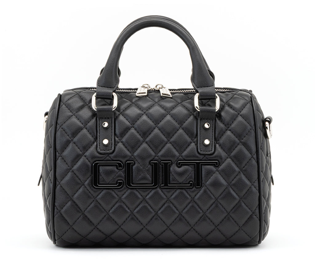 Design retrò e attitudine rock si incontrano nella mini Bowling Bag Girlschool per la stagione SS26, un accessorio versatile pensato per chi ama distinguersi nel quotidiano. Realizzata in morbida ecopelle nera, questa borsa si distingue per la pregiata lavorazione trapuntata a diamante e per il maxi logo CULT cucito a rilievo sulla parte frontale. Caratterizzata da una forma strutturata con doppi manici e tracolla rimovibile, fonde perfettamente eleganza senza tempo e un’estetica profondamente contemporanea. Dimensioni: 23x17x13,5.