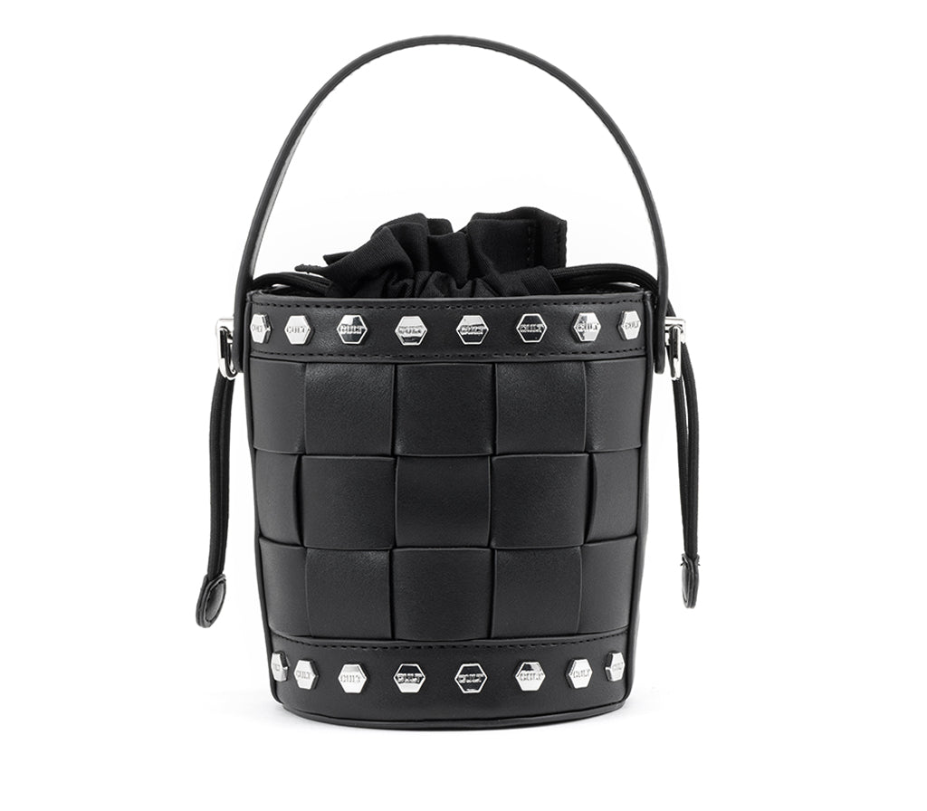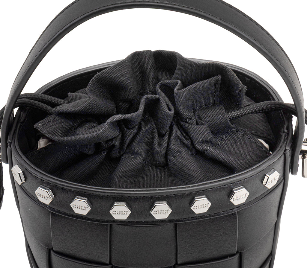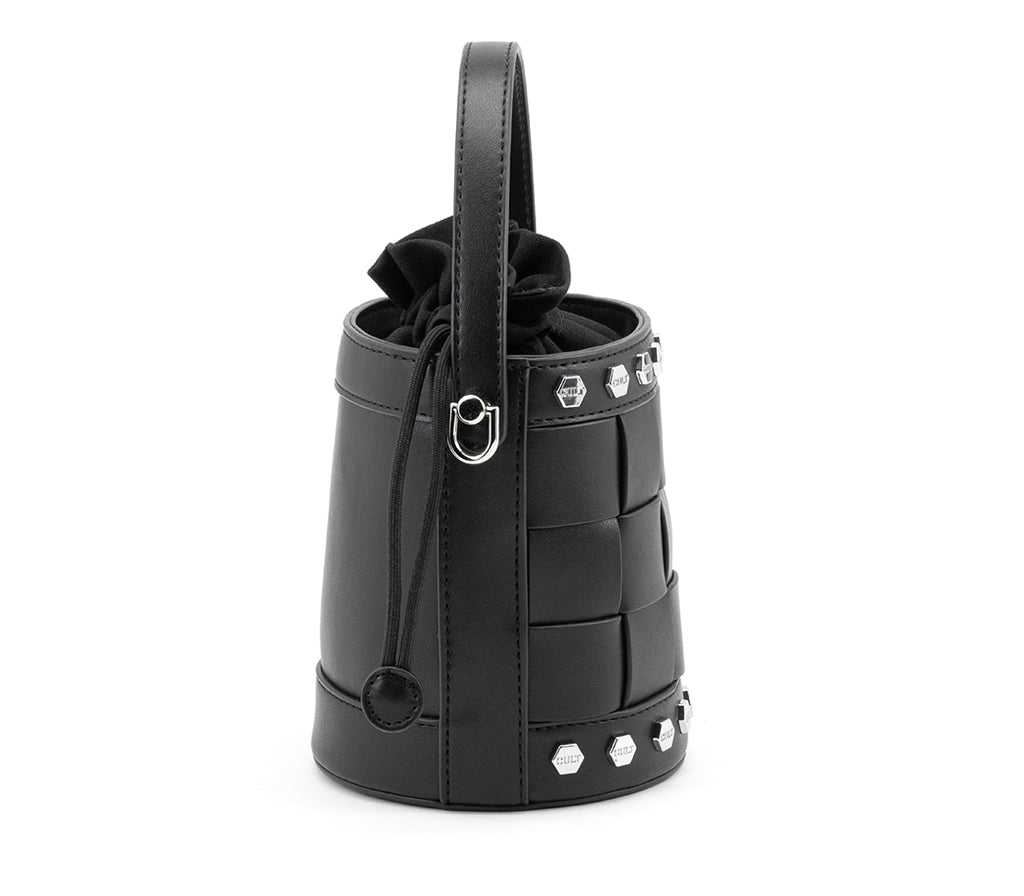 Anima ribelle e dettagli preziosi definiscono la Rock Bucket per la stagione SS26, una mini borsa a secchiello che incarna l'essenza più audace del brand. Il design si distingue per un'esclusiva lavorazione a intreccio maxi in ecopelle nera, incorniciata da una doppia fila di borchie sferiche silver che ne esaltano i profili. Completa di una chiusura a coulisse e di un manico rigido, è l’accessorio must-have per chi cerca un look d'impatto e fuori dagli schemi. Dimensioni: 12x15x12