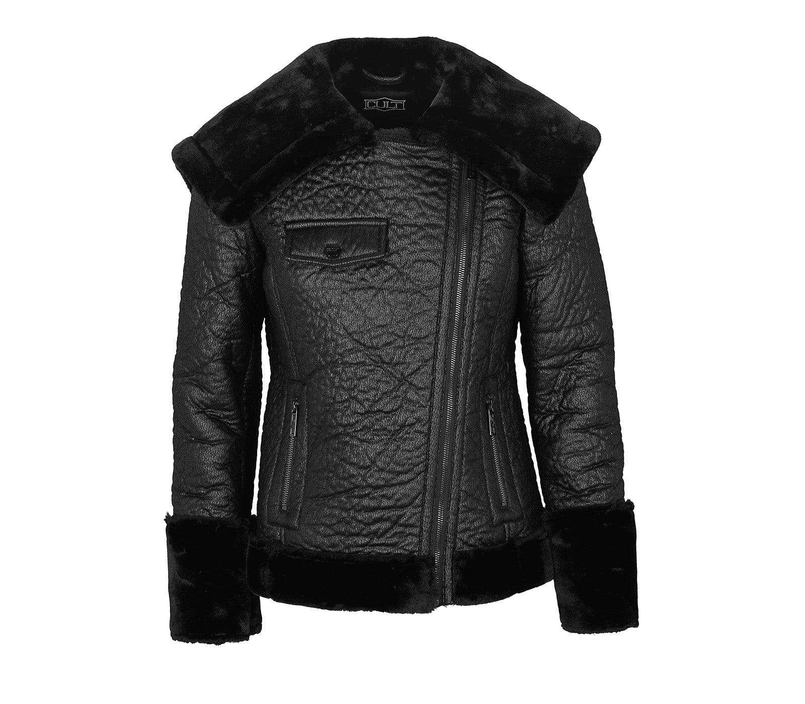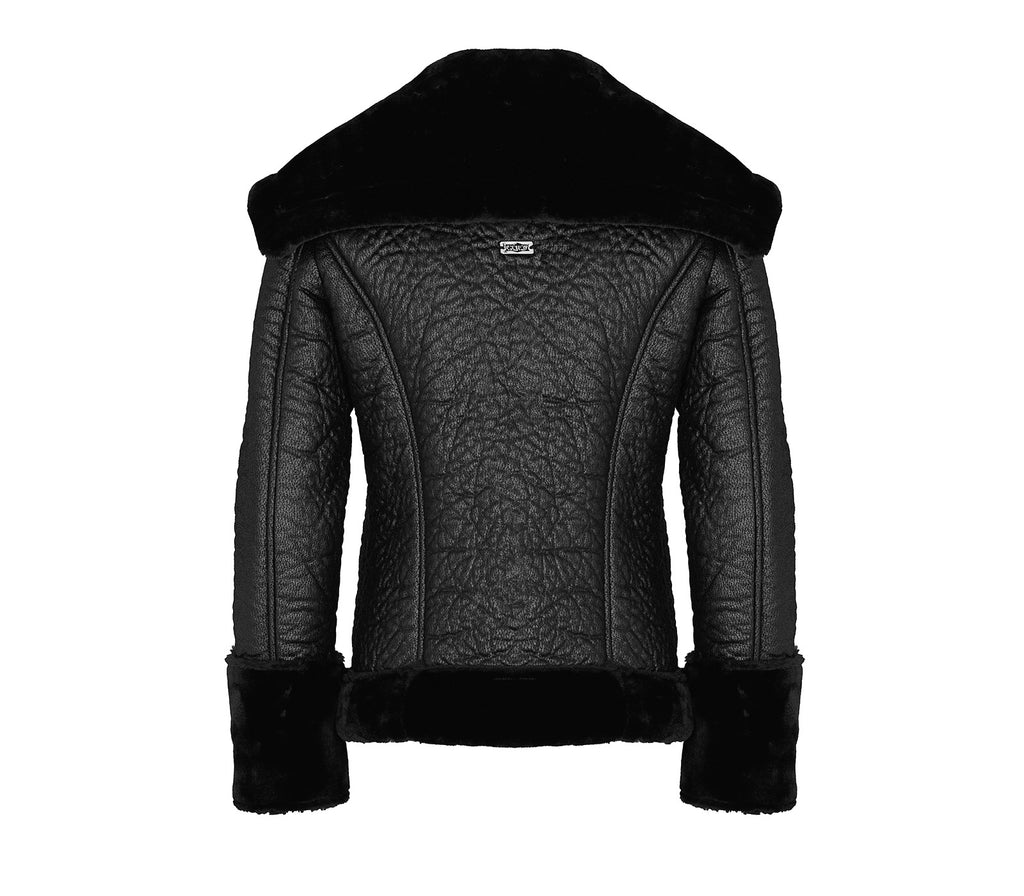 Glamour ed essenziale, questa morbida giacca aviator in eco montone non passerà inosservata. L'ampio collo, polsini e fondo in shearling offrono calore e comfort, mentre la zip asimmetrica aggiunge un tocco di praticità. Con due tasche laterali dotate di chiusura a zip, questa giacca è un mix di funzionalità e design.