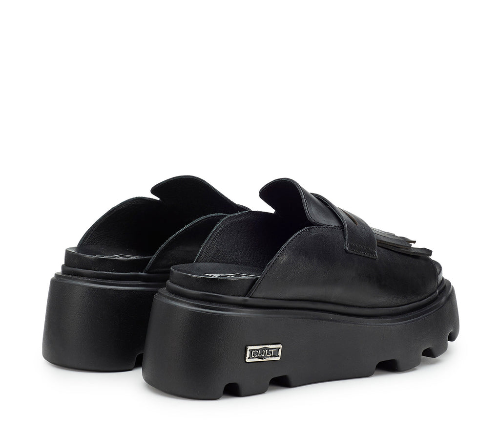 Cult fonde le silhouette dei sandali con quelle dei mocassini per creare questi comodi slingback platform con la punta aperta tonda. Questo modello presenta un’ampia tomaia in pelle nera con la classica mascherina e frange e poggia sulle iconiche suole scanalate.