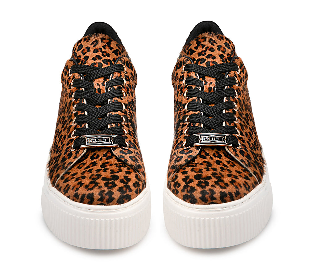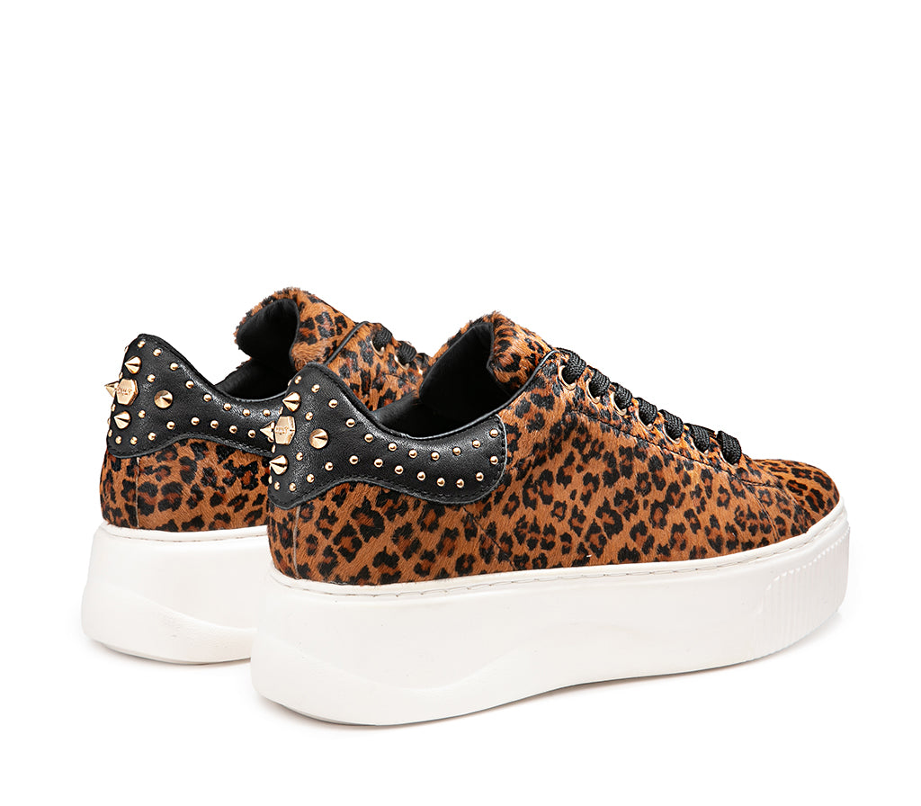 Sneaker platform interamente in pony hair stampa giaguaro, impreziosita da dettagli in pelle nera con borchie. Un design grintoso e deciso, pensato per chi ama distinguersi con uno stile rock-chic.