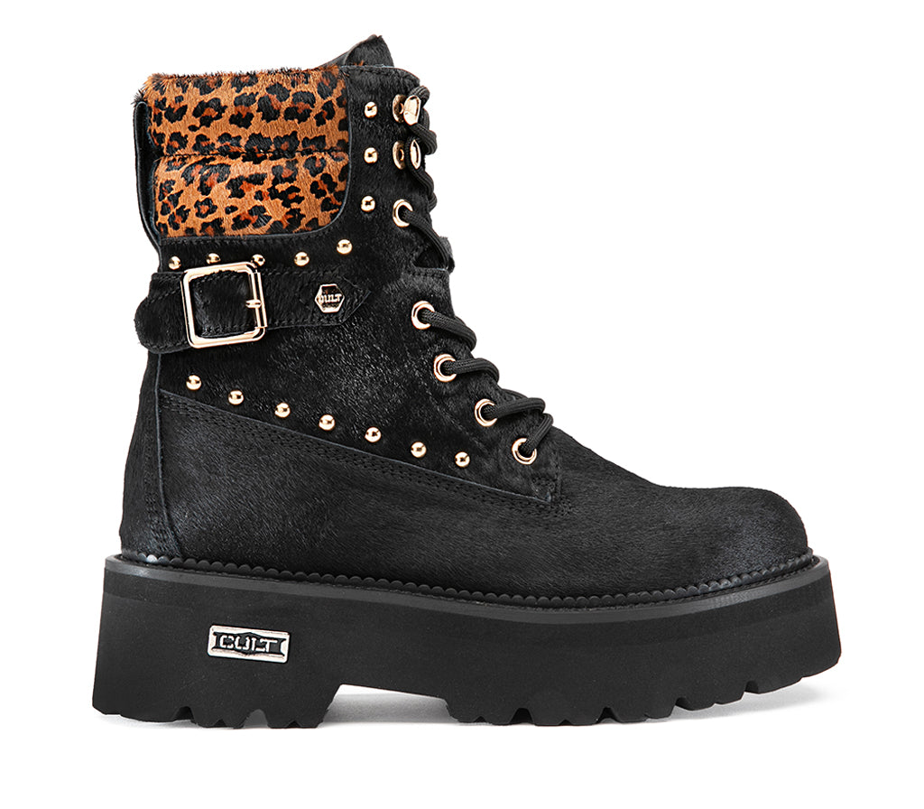 La classica combat si fa wild. In pelle nera con linguetta e collo in pony skin stampa jaguar, mixa struttura e animalier con equilibrio perfetto. Un twist fashion su un’icona grunge.