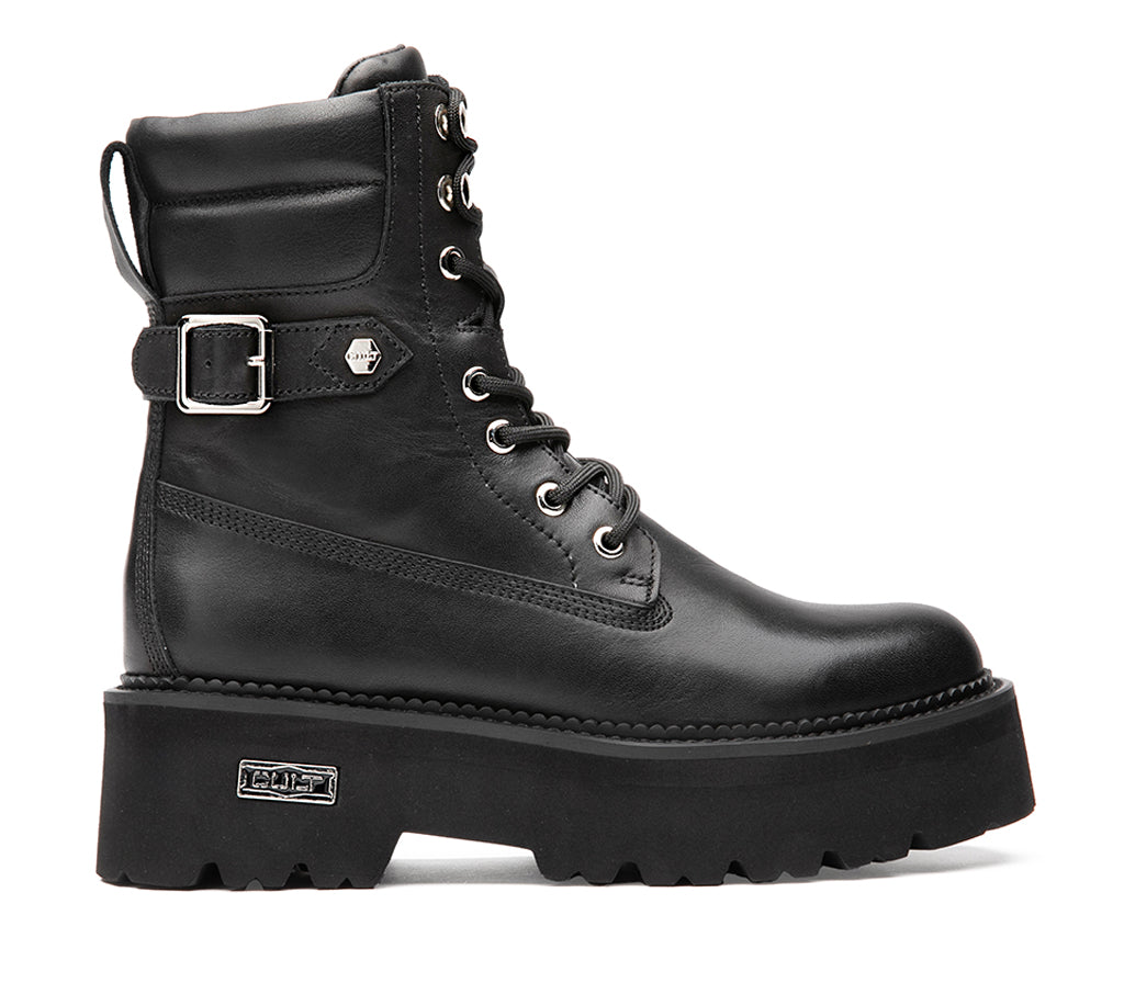 Combat boot in pelle nera liscia, con suola massiccia e dettagli metallici. Una silhouette solida, ispirata al mondo militare, ma reinterpretata in chiave urbana. Decisa, essenziale, senza compromessi.