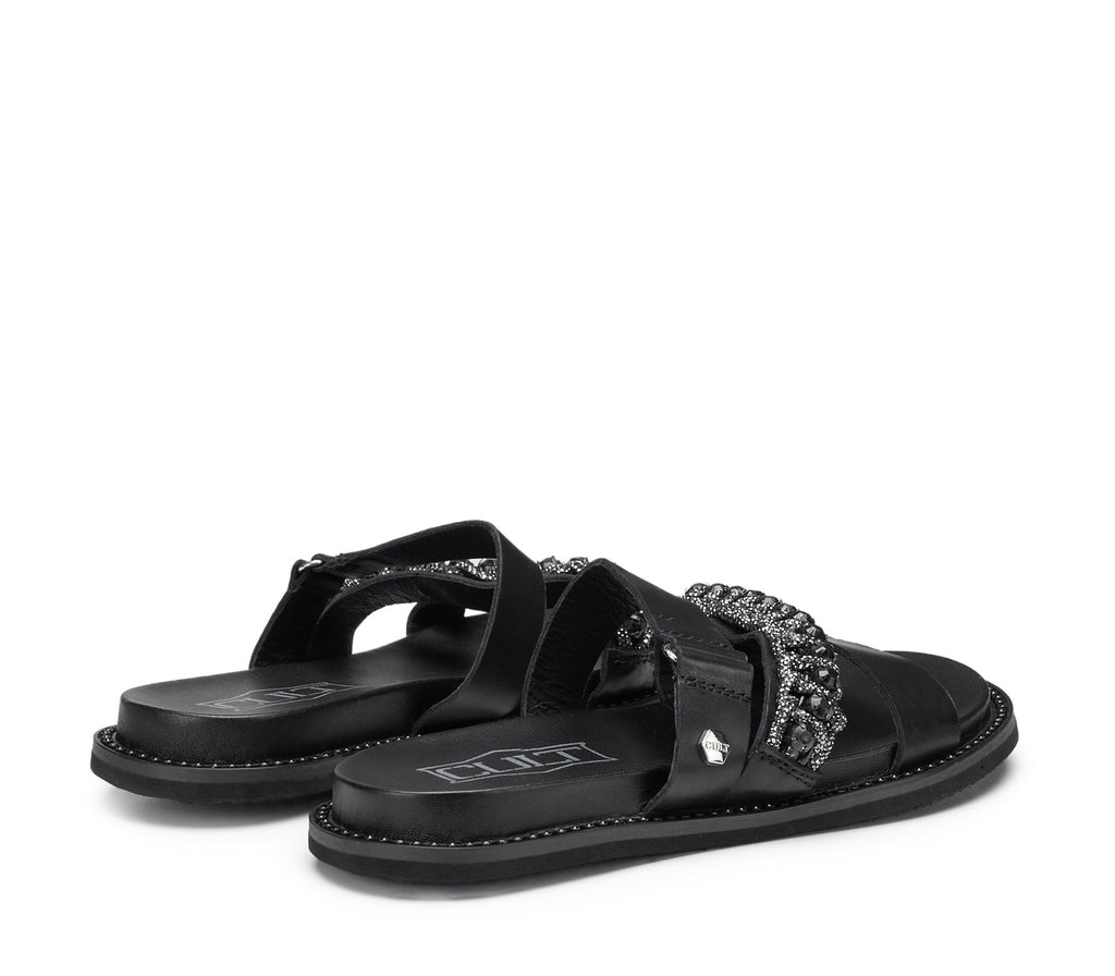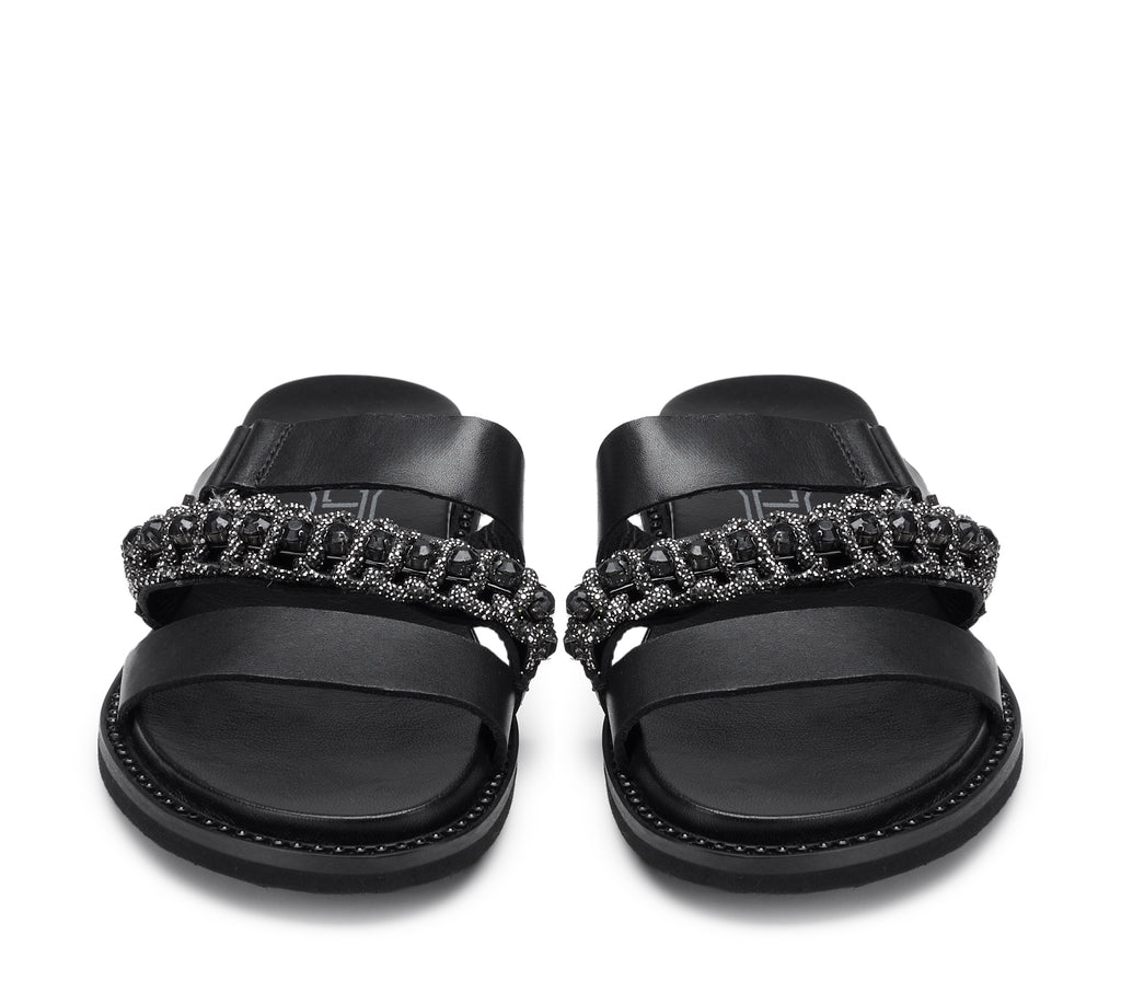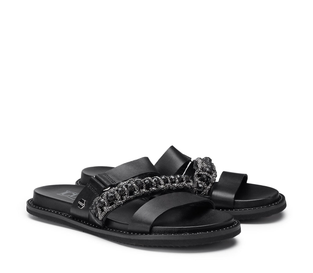 Rock ed effortlessy cool, questi sandali Roshelle firmati Cult diventeranno subito le vostre flats favorite. Il modello è realizzato in pelle nera con sottili fascette decorate da dettagli in strass e gemme sur tone per un delicato tocco glamour. Un sandalo distintivo che illuminerà tutti i vostri look estivi.