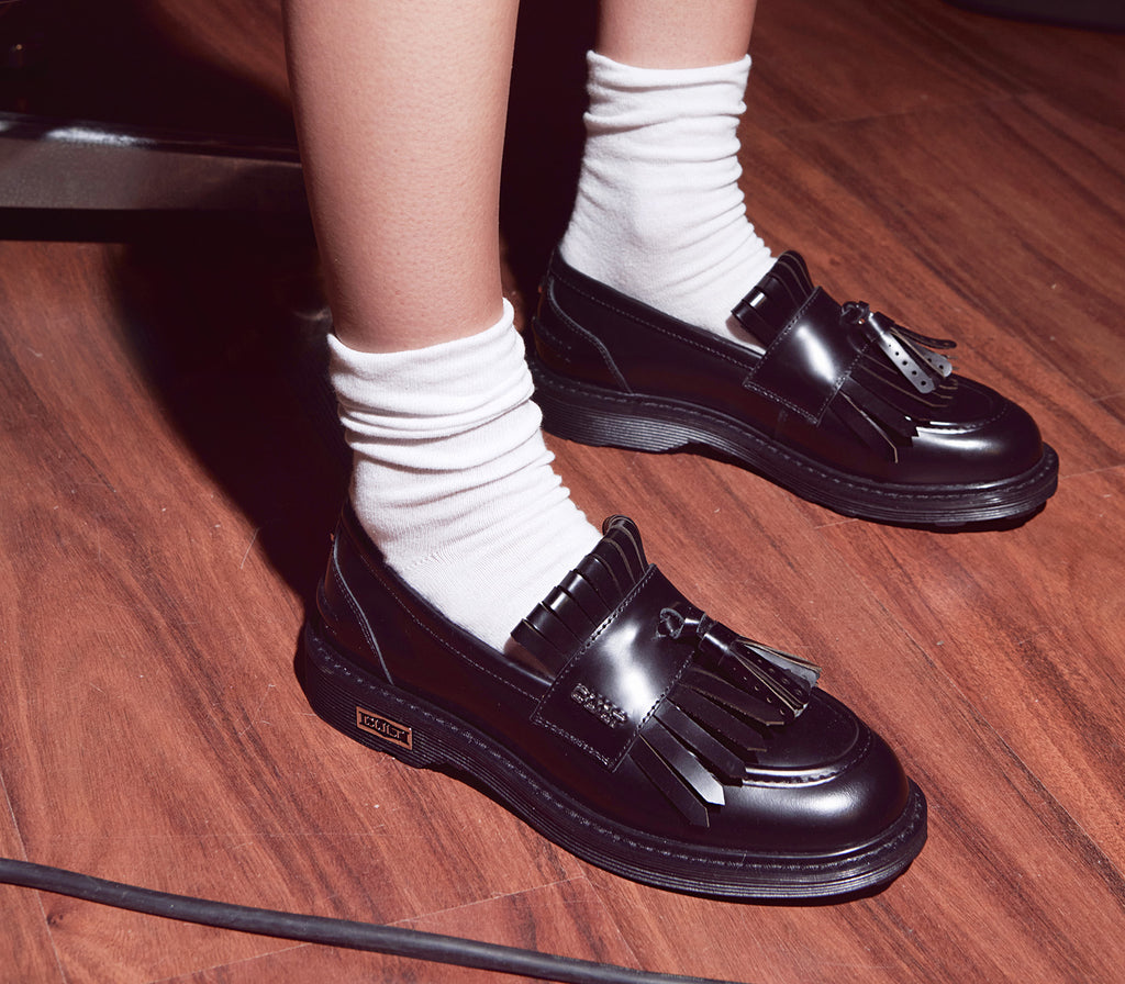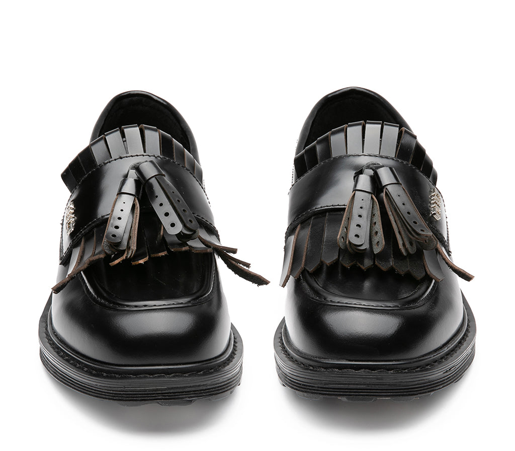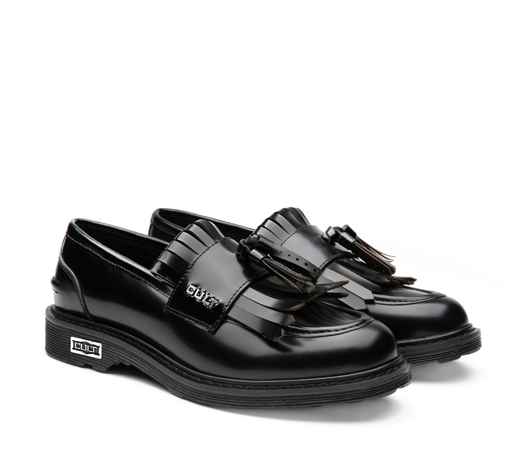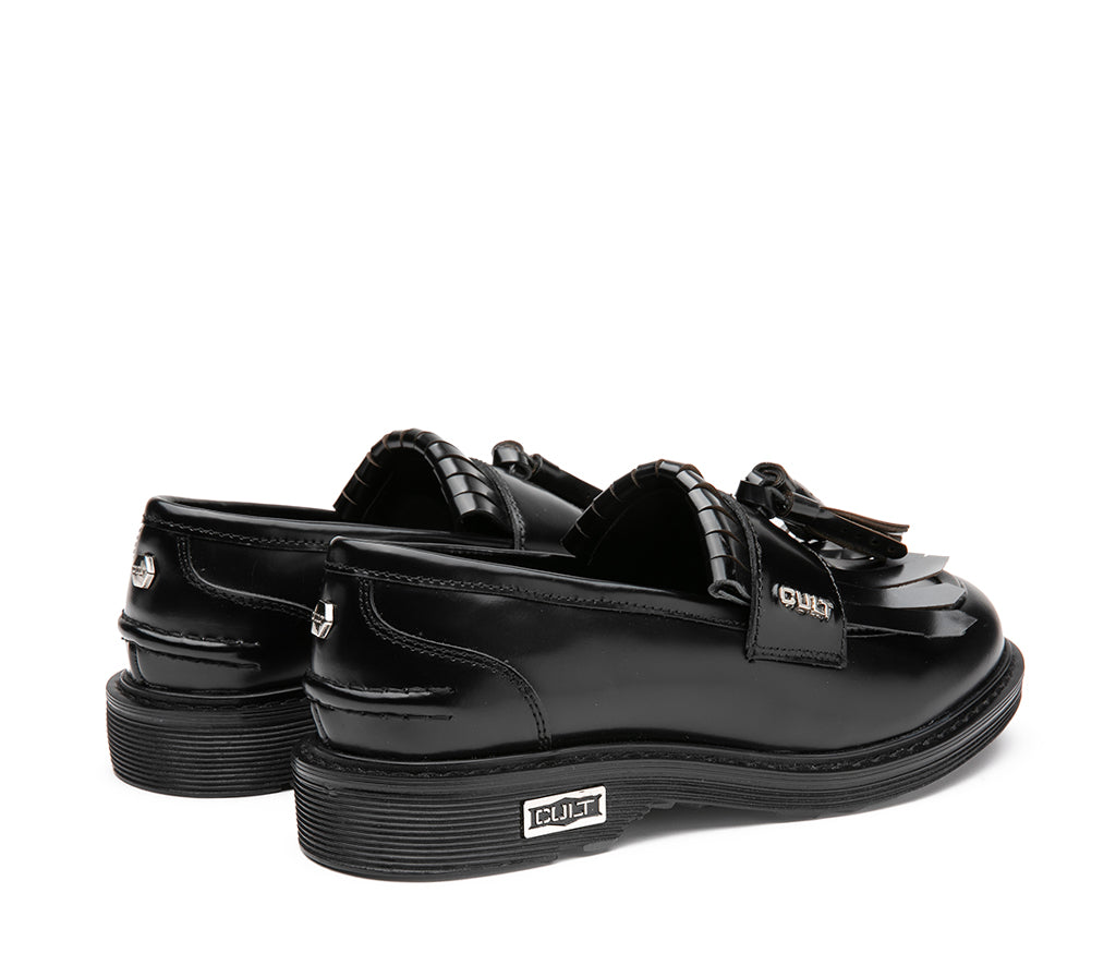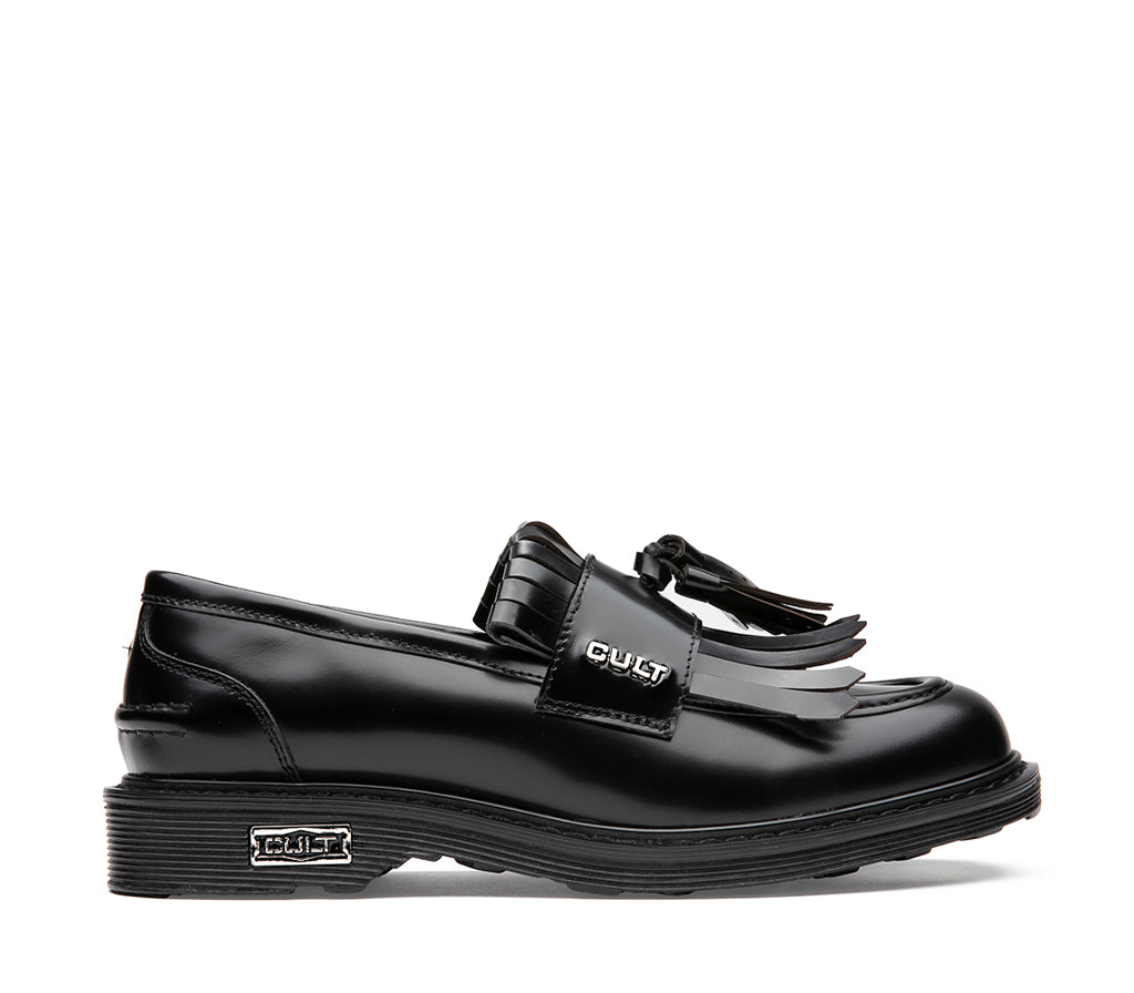 Mocassini low da donna in pelle nera con finitura brillante, ispirati all’estetica ribelle di Cult. Il modello è impreziosito da frange e nappine frontali che aggiungono un tocco rétro al design. La linea pulita e il design minimal sono esaltati dalla suola platform e dalla costruzione solida. Ideali per un look deciso e contemporaneo.
