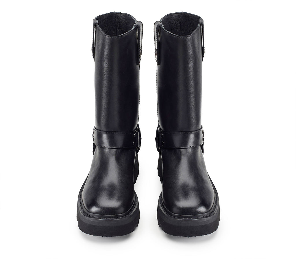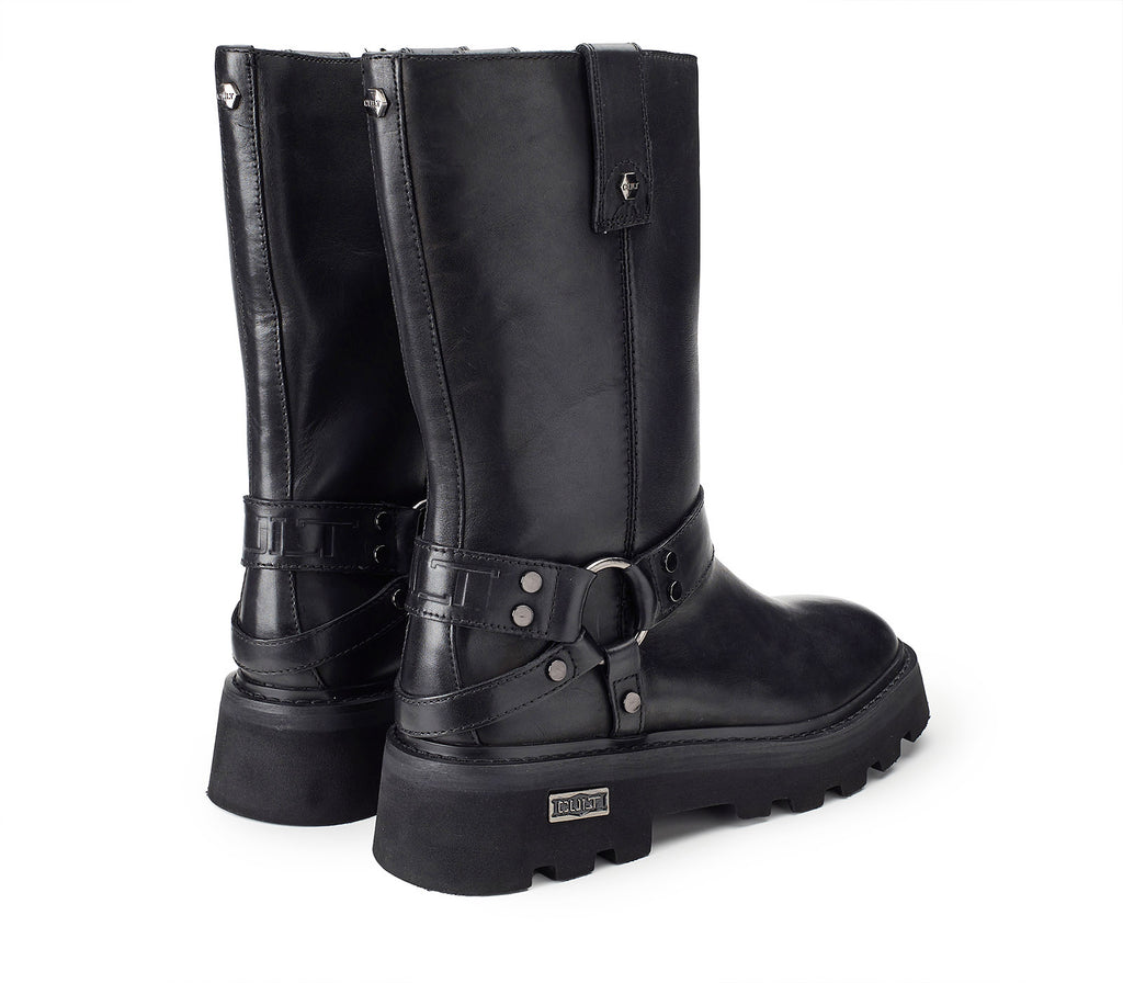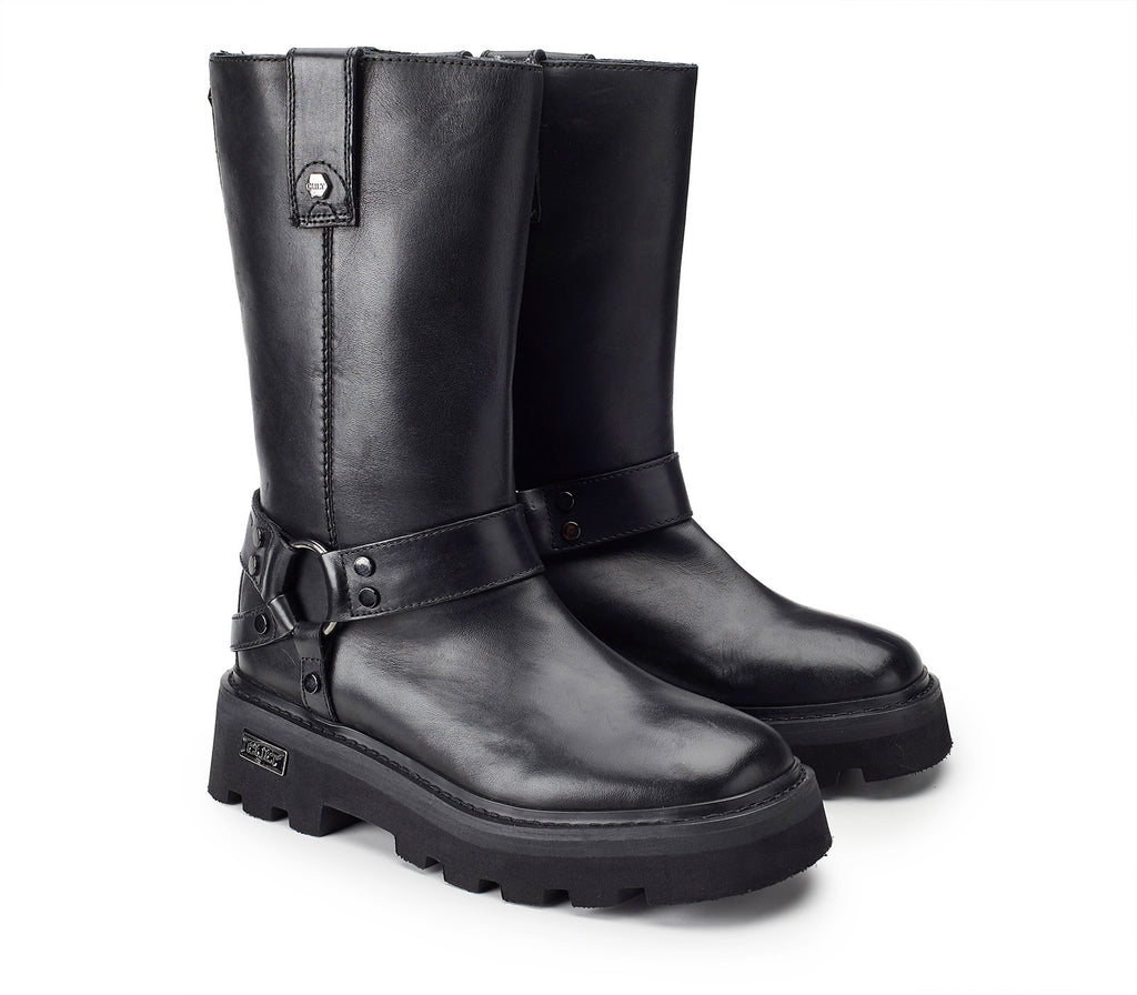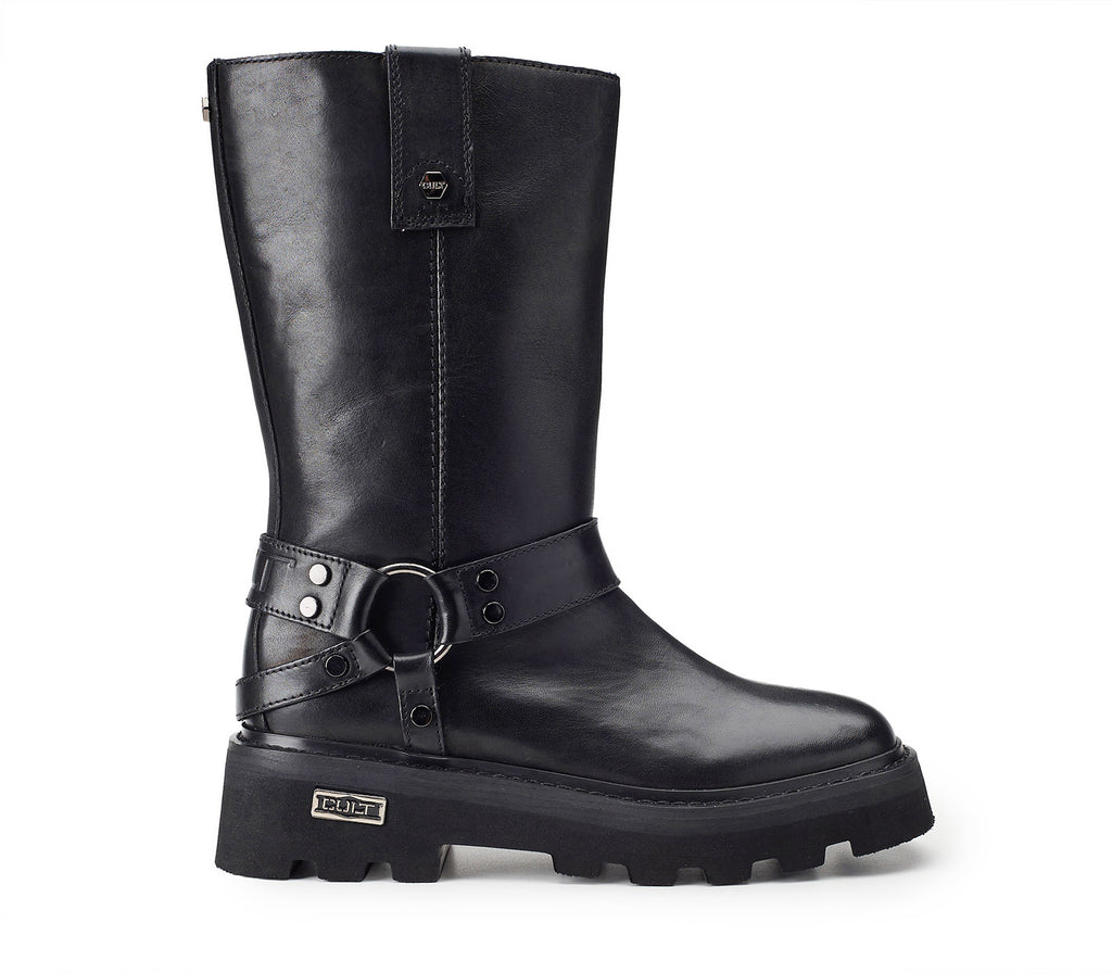 Per chi preferisce esternare la propria forza e audacia Cult ha ideato gli stivali biker della famiglia Skin. Realizzati in pelle nera poggiano su una suola leggera in EVA+gomma, a dima quadrata, con l'iconica e immancabile targhetta metallica Cult e sono rifiniti con una ghetta con tre cinturini ad anello.