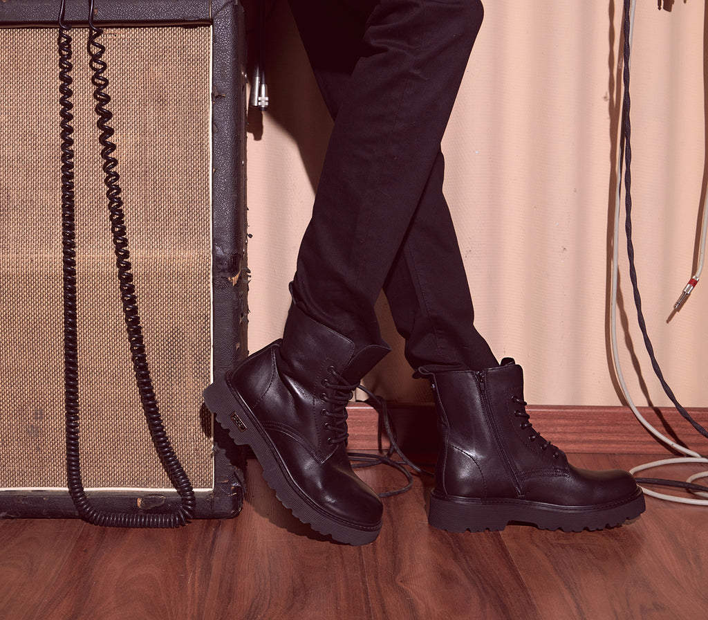 Comodi ma senza rinunciare all'anima rock gli anfibi stringati firmati da Cult per questo inverno. Un modello intramontabile di stivaletti in pelle, con occhielli in metallo, targhetta con logo sulla suola di gomma e linguetta posteriore. Da indossare con jeans e pantaloni informali.
