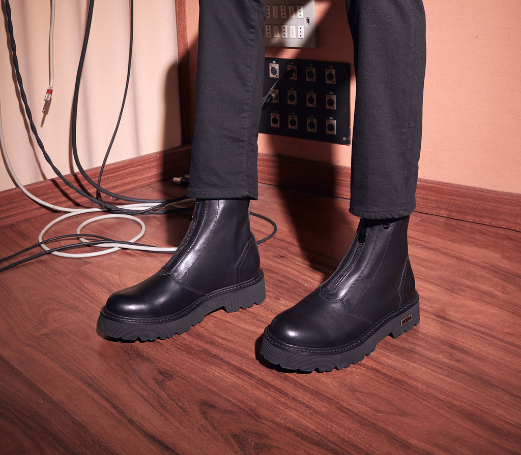 Gli stivaletti in pelle nera di Cult abbinano linee intramontabili a un carattere contemporaneo. Montati su una suola carrarmato extra-light con l'iconica targhetta metallica con il logo del brand, sono realizzati in morbida pelle e presentano una zip metallica in evidenza sul davanti.