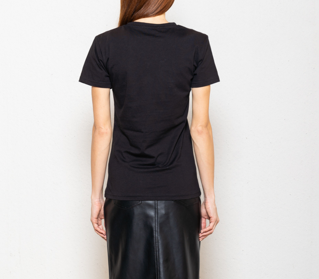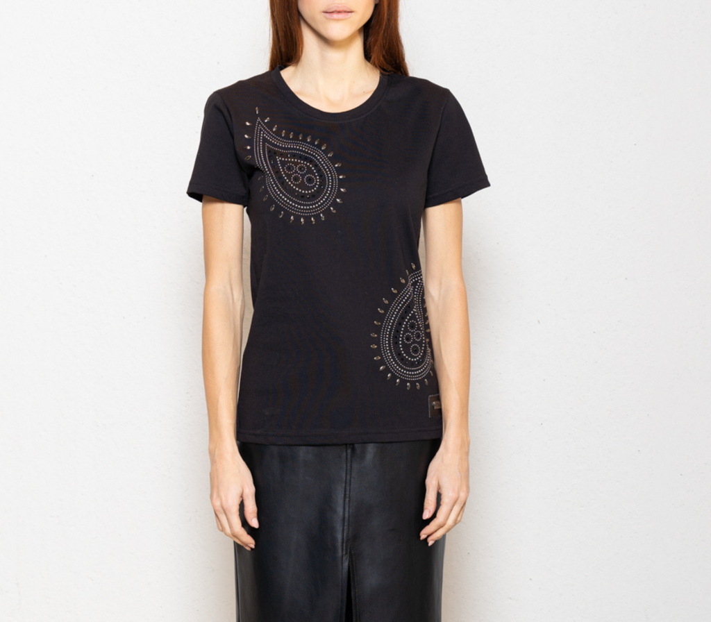Dichiarate il vostro amore per Cult indossando questa T-shirt nera da donna della nuova collezione. Realizzata in puro cotone con le applicazioni in stile paisley, presenta le maniche corte classiche e sarà il jolly di stile che non vi stancherete mai di indossare.