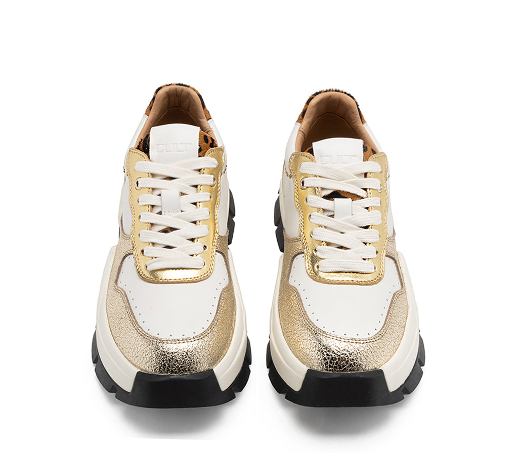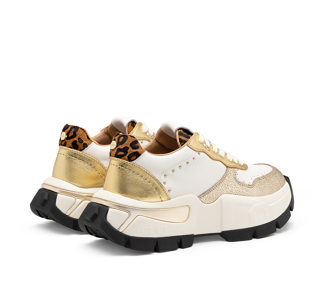 Sneaker in pelle bianca con effetti animalier e laminati in platino e oro, per un design ricco di riflessi e dettagli luminosi. Perfetta per chi ama aggiungere un tocco luxury al suo stile glam-rock.