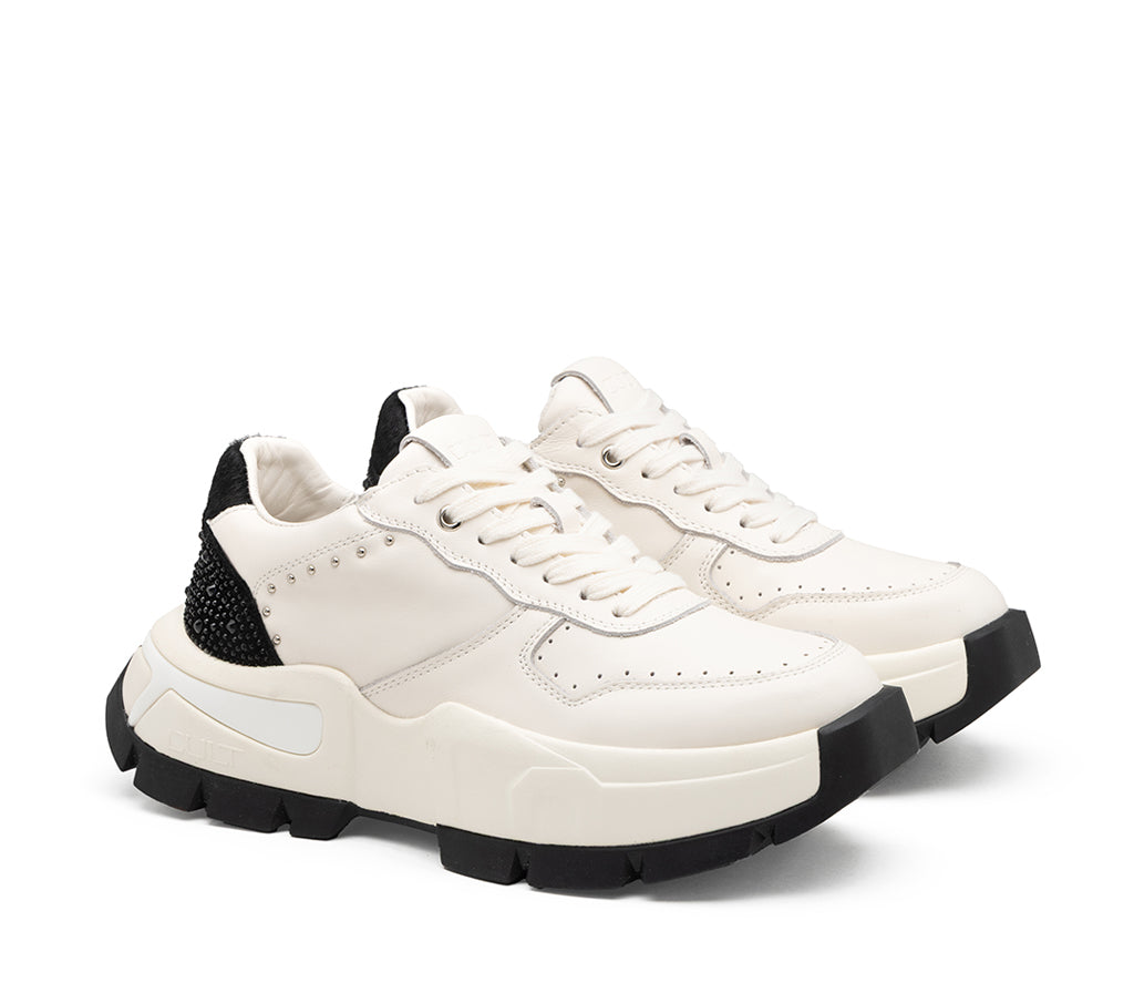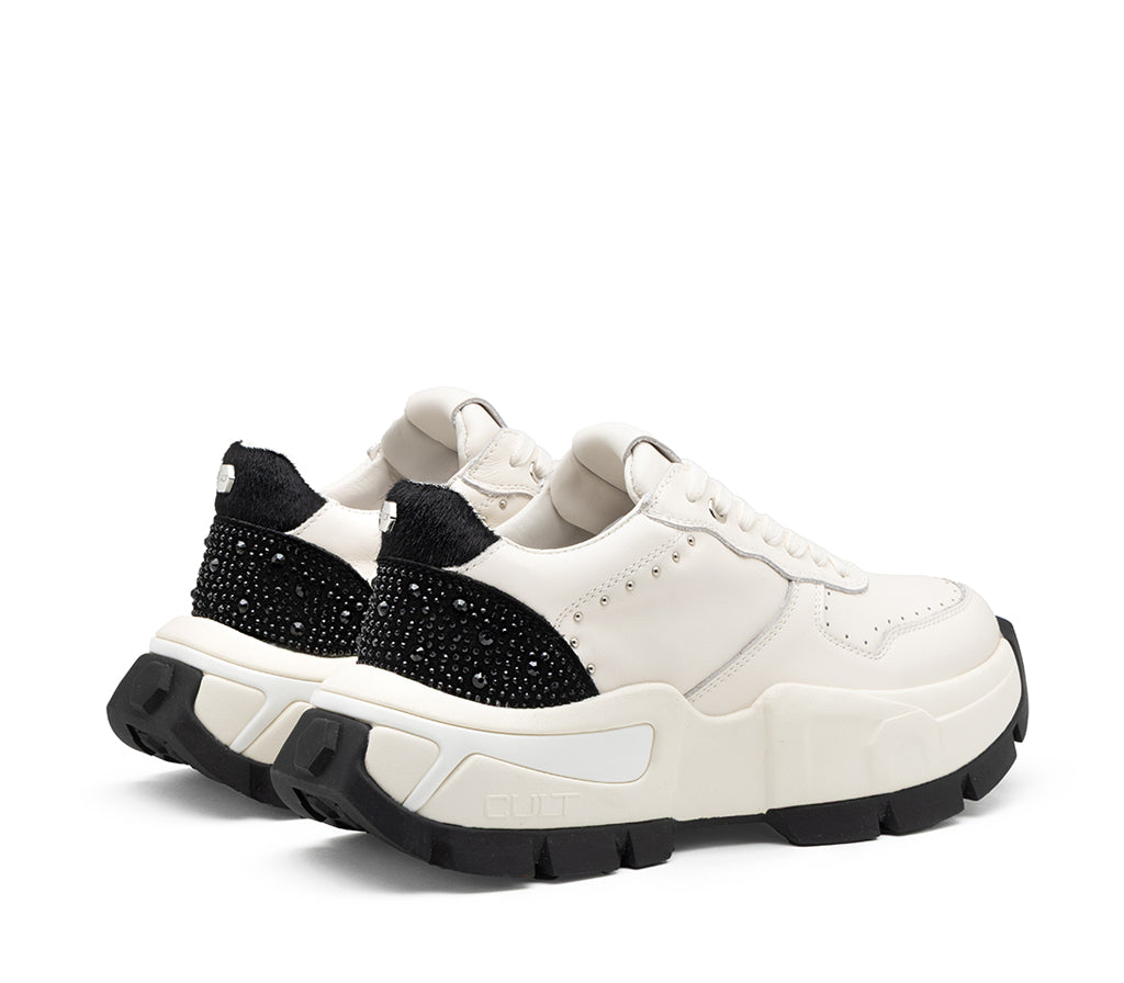 Sneaker low-top dalla personalità contemporanea, realizzata in un raffinato mix di pelle liscia off white e dettagli in suede nero con glitter luminosi sur-ton. Il contrasto cromatico esalta le linee pulite della silhouette, mentre la suola robusta aggiunge carattere e versatilità urbana.